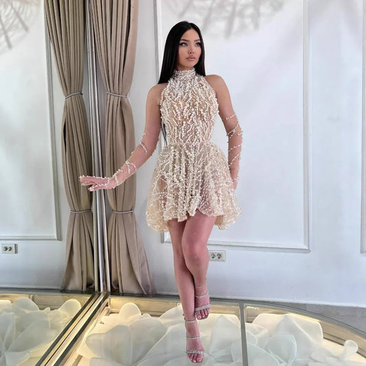 Arabic Nude Pearl Beaded High Neck Short Party Dress with Gloves LA72345D