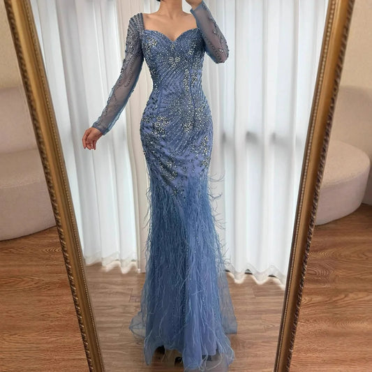 Arabic Blue Feather Beaded Mermaid Evening Dress for Women LA71818