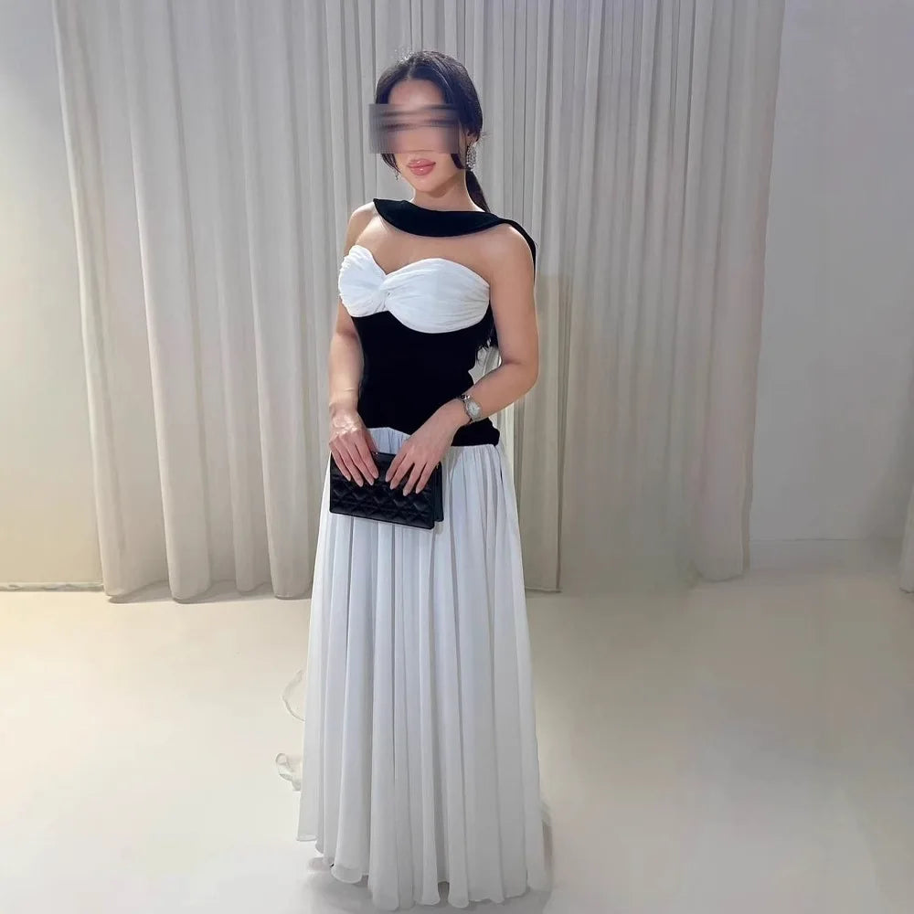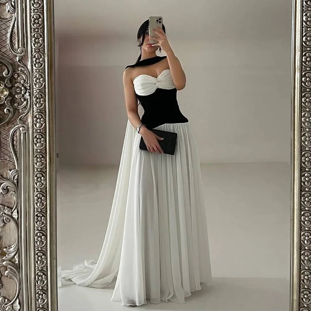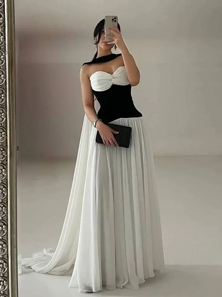 Stylish black and white strapless A-line prom dress with bold contrast color. Perfect for evening parties and formal celebrations.