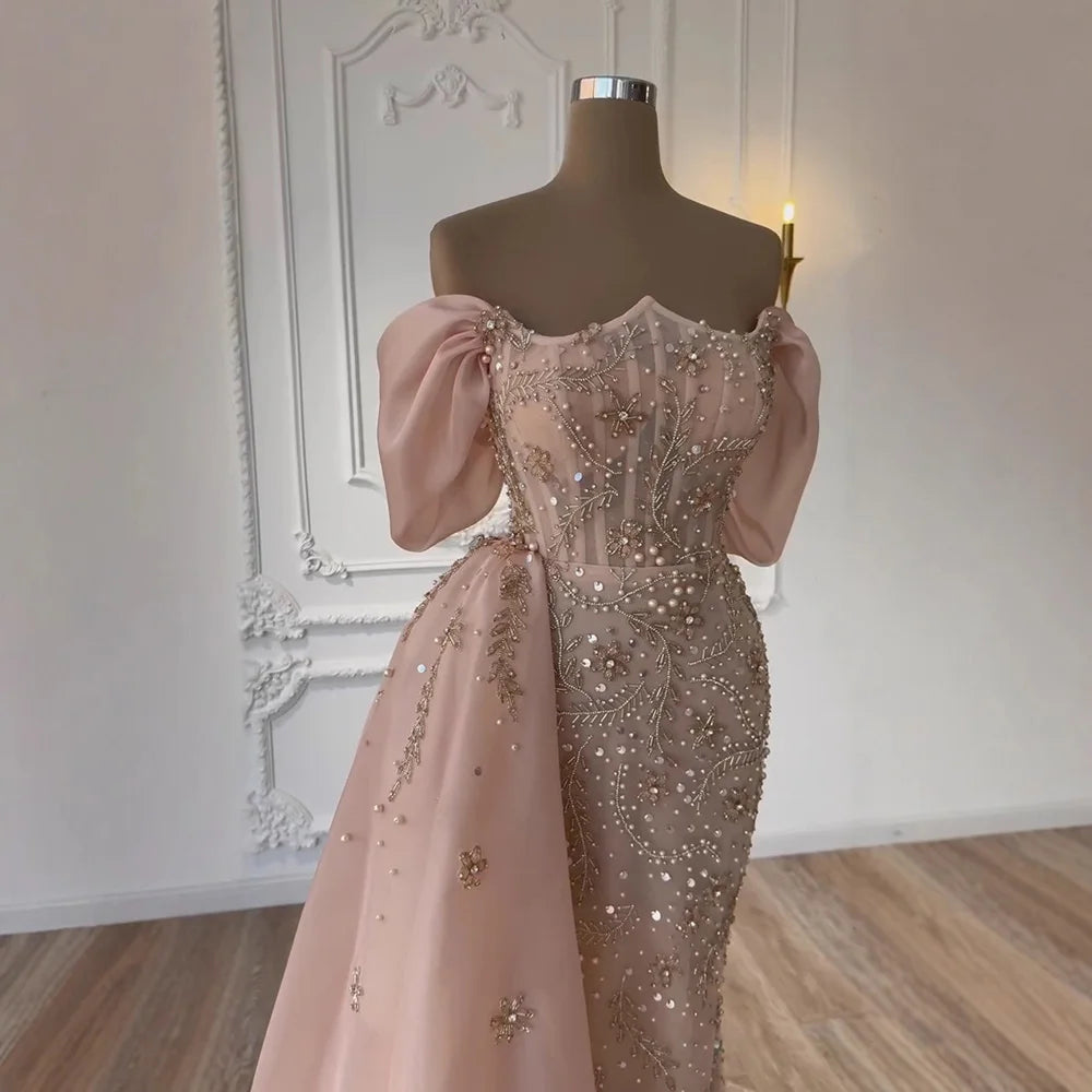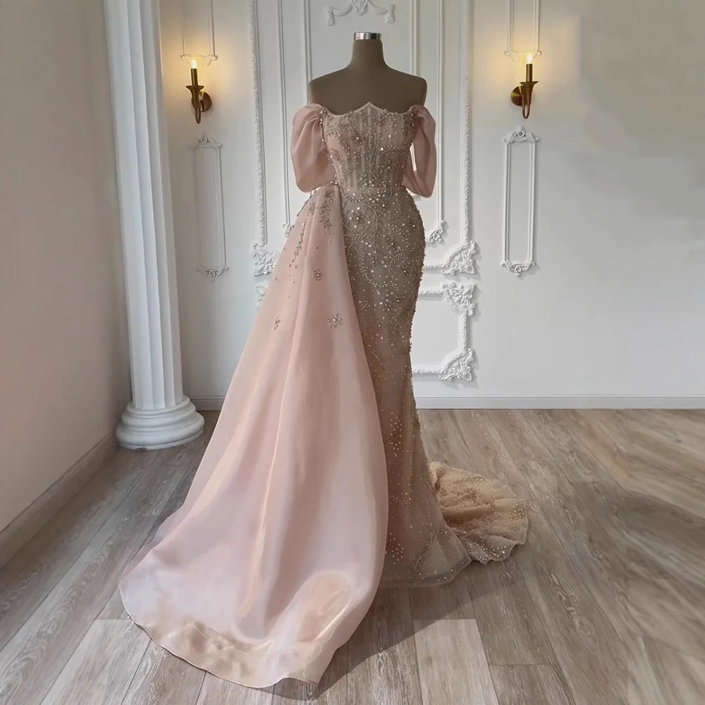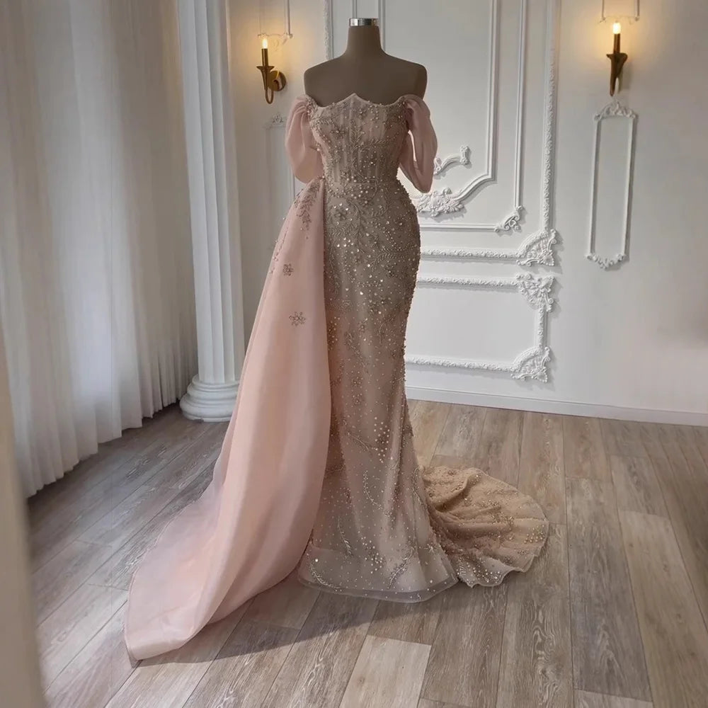 Luxury Nude Off Shoulder Pearl Beaded Mermaid Evening Dress with Overskirt LA73109