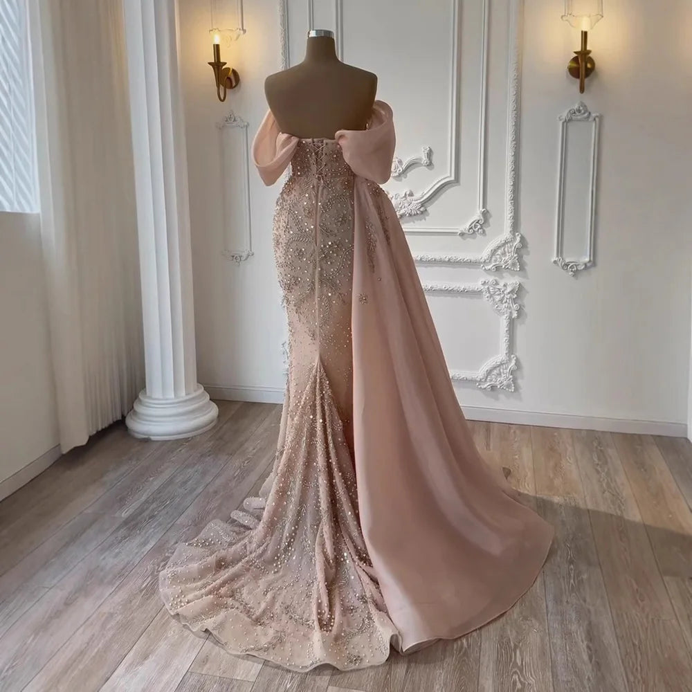 Elegant nude mermaid evening dress with pearl beading, off-shoulder neckline, and detachable overskirt. Ideal for Arabic weddings, galas, and formal events.