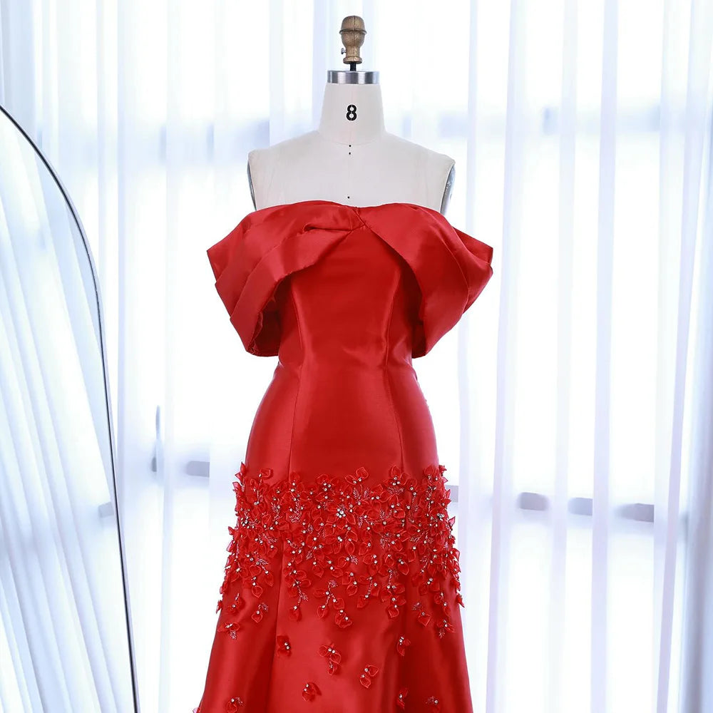 Elegant peach satin mermaid evening dress with delicate appliques. Ideal for weddings, parties, or formal occasions. Sophisticated silhouette for standout style.