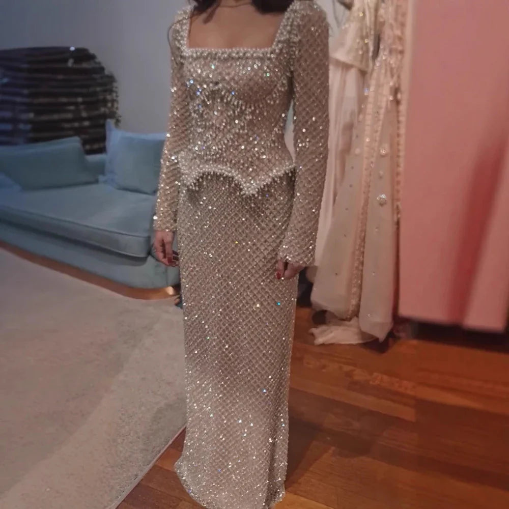 Luxury Pearl Beaded Mermaid Evening Dress with Long Sleeves LA72919A