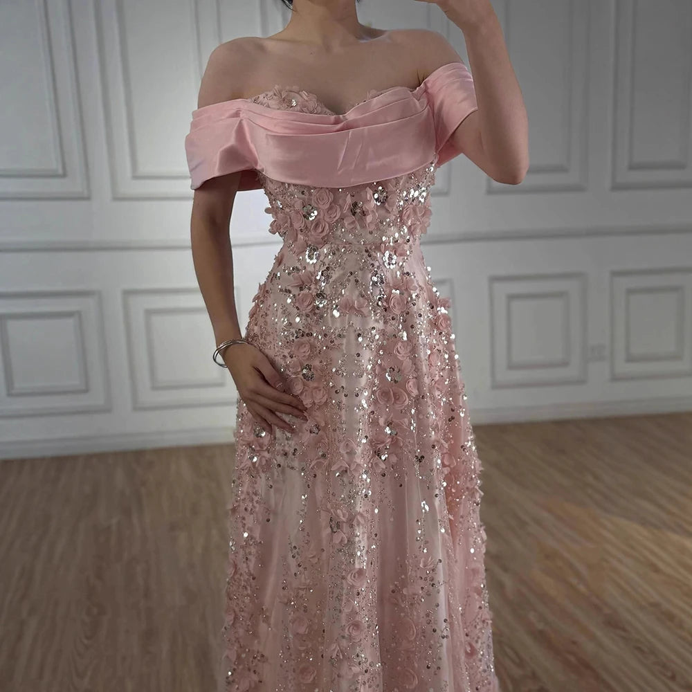 Luxury pink A-line evening dress LA73157 with 3D floral and beaded details, perfect for formal occasions and 2025 parties.