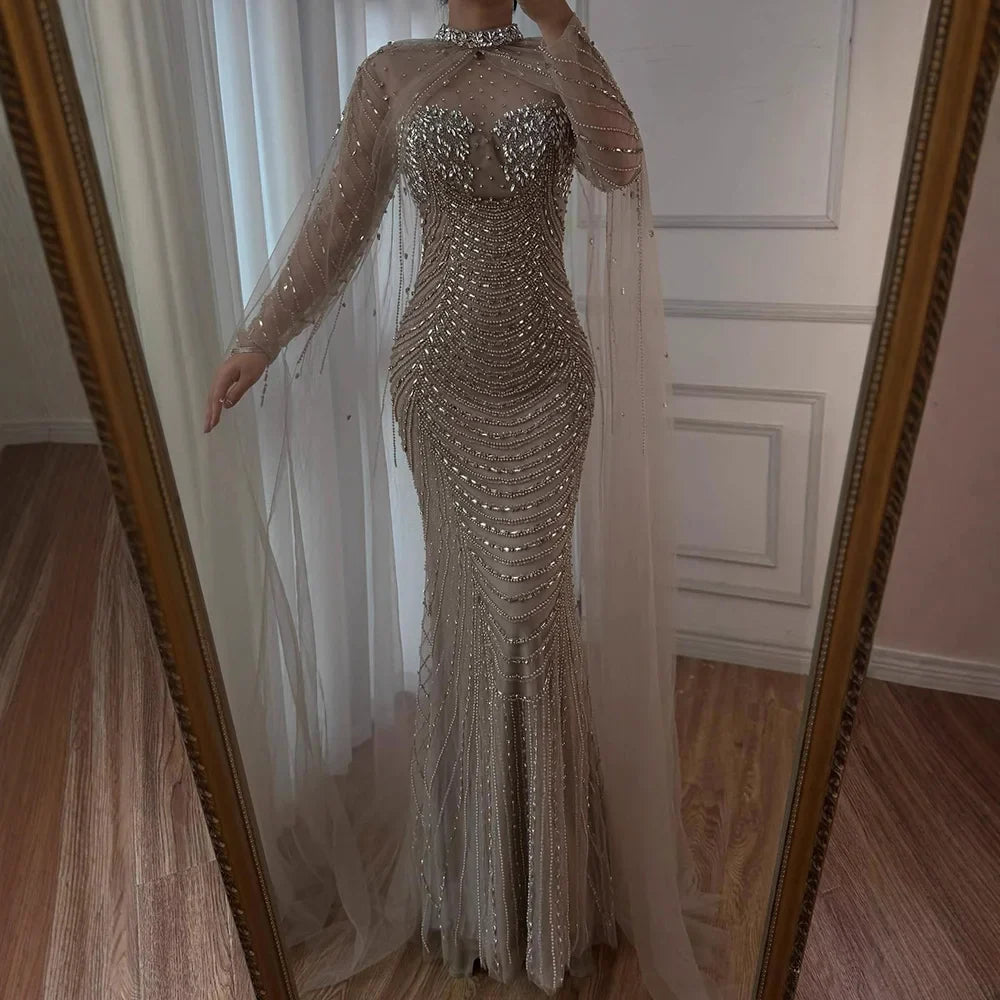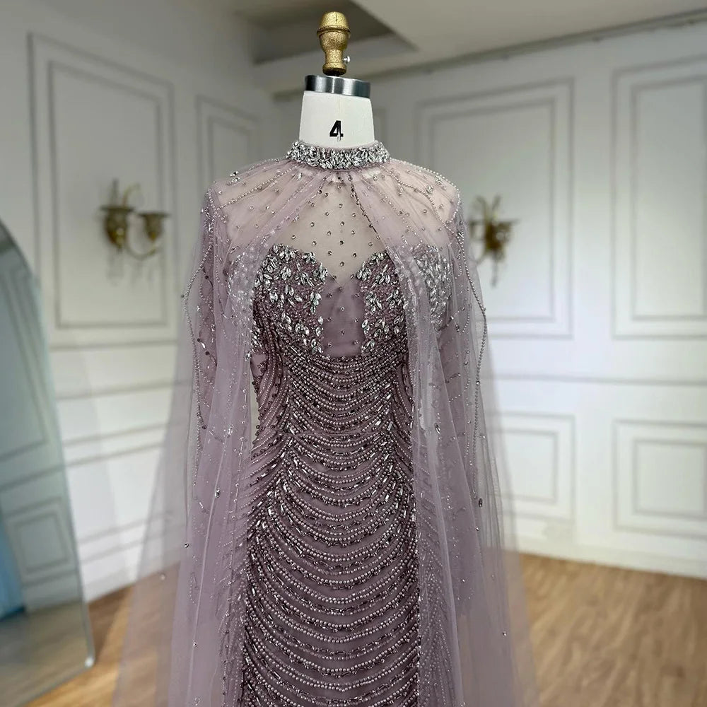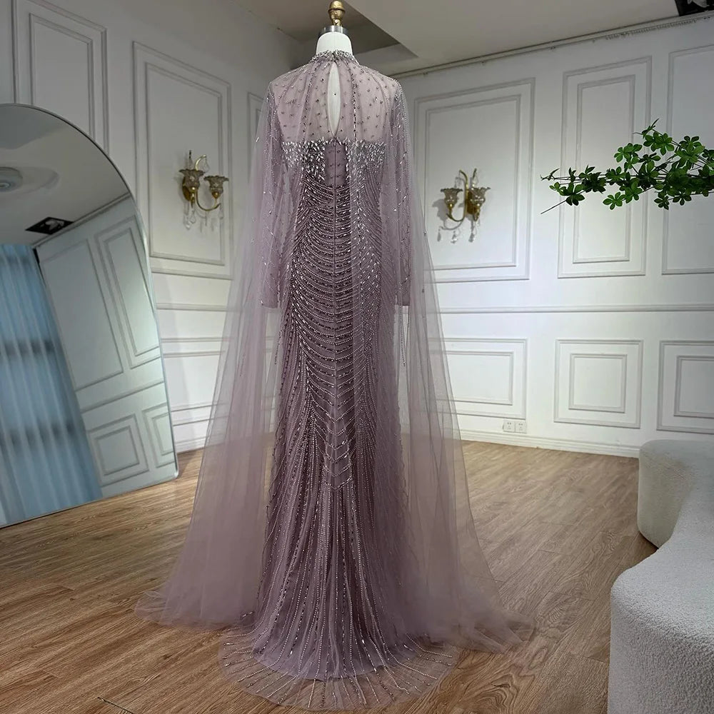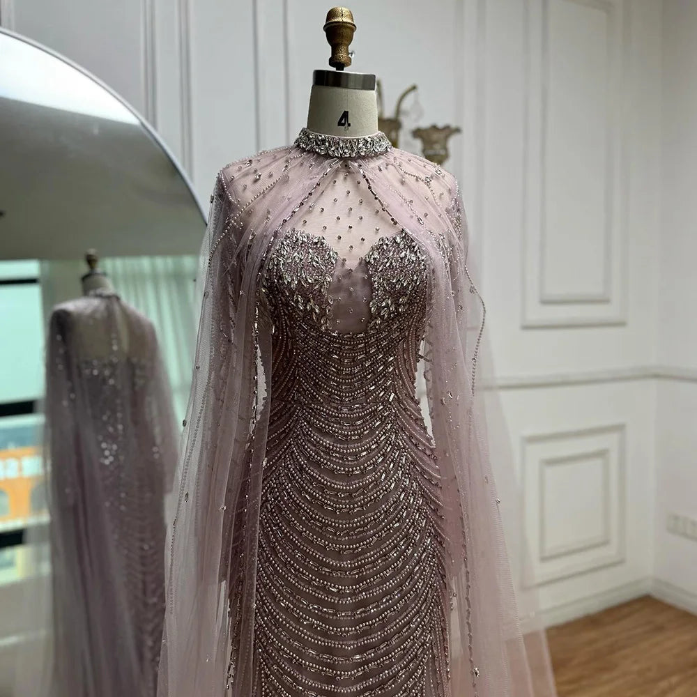 Luxury Pink Beaded Cape Sleeve Arabic Evening Dress LA73134