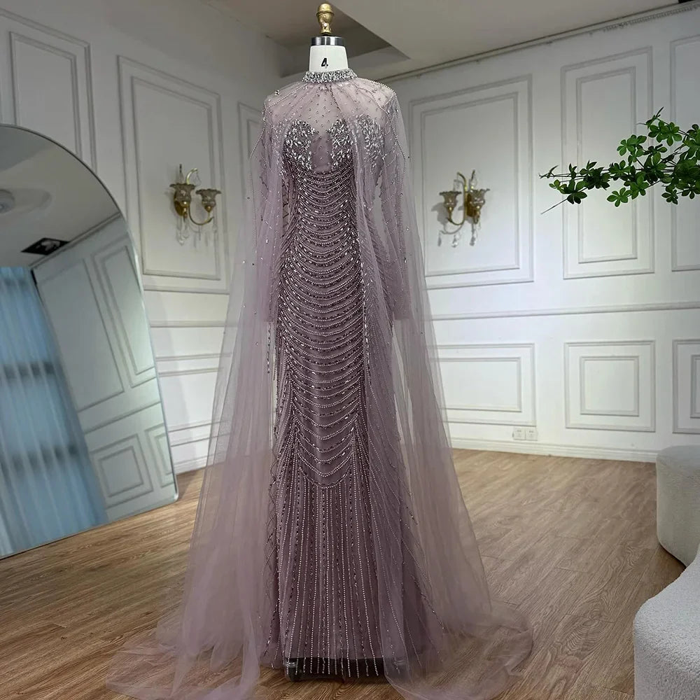 Elegant luxury pink Arabic evening dress LA73134 with beaded cape sleeves, designed for weddings, parties, and formal occasions.