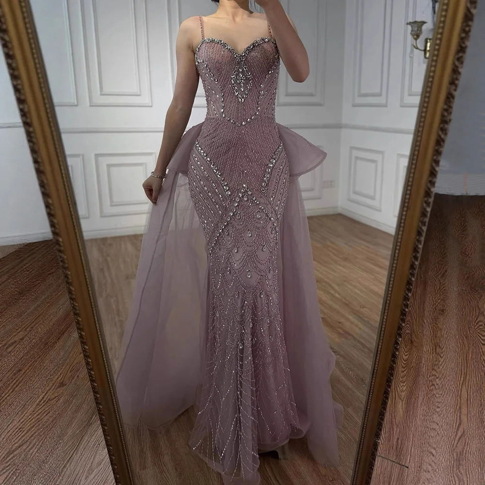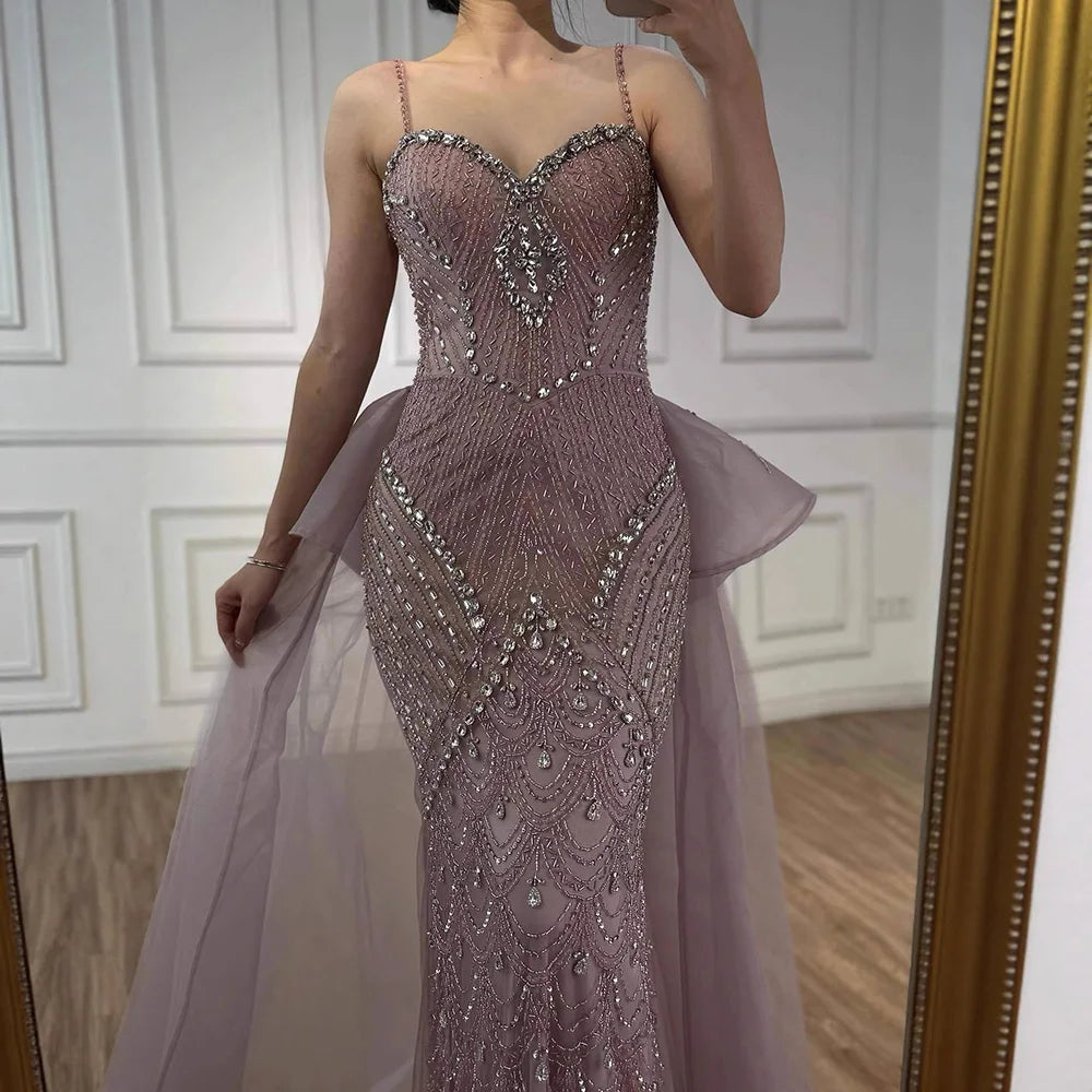 Luxury pink crystal beaded mermaid evening dress LA73143 with spaghetti straps and detachable overskirt, perfect for weddings, galas, and formal occasions.