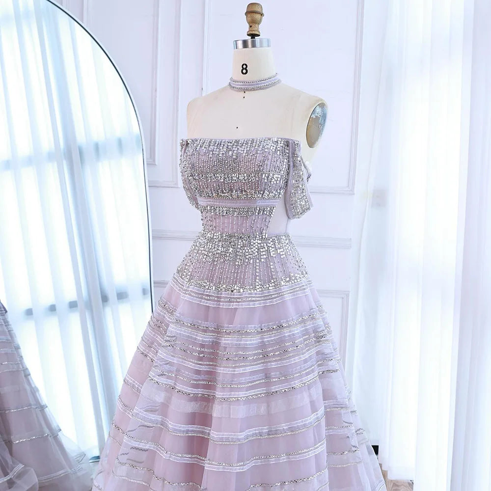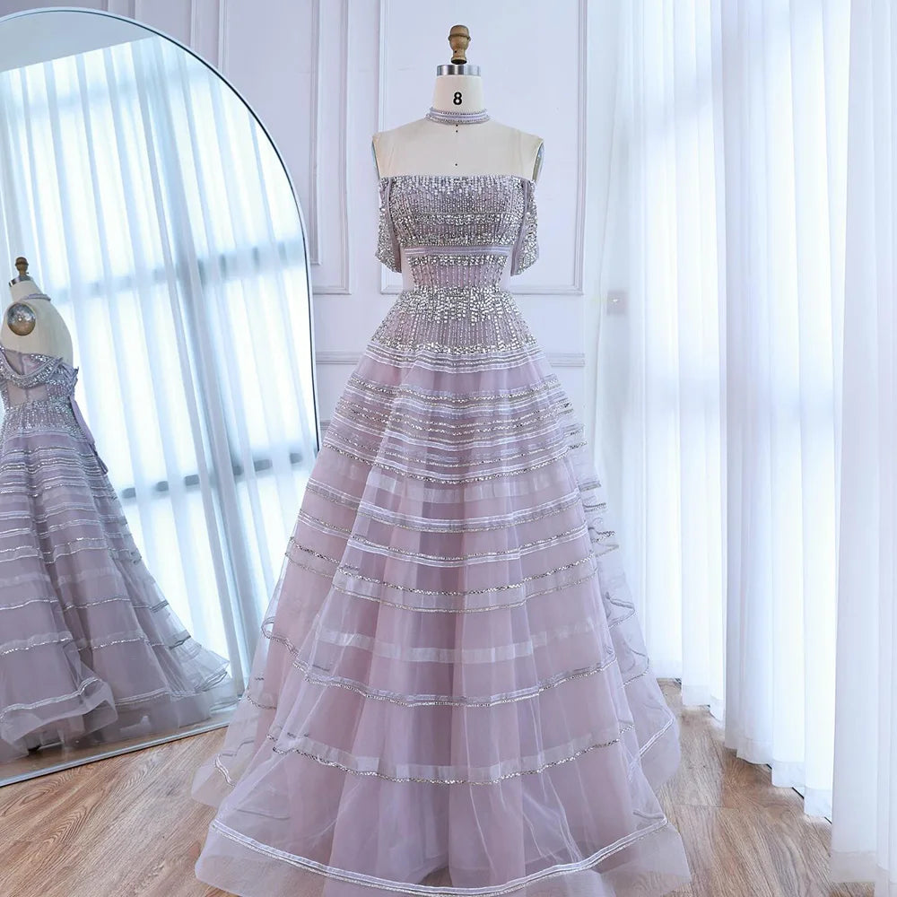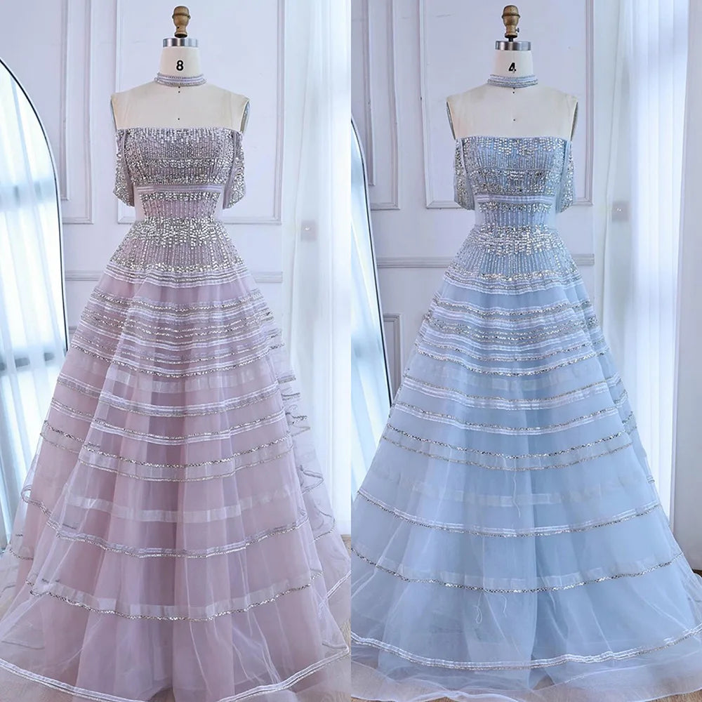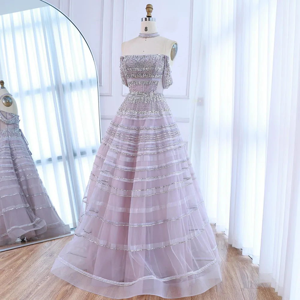 Luxury Pink Off Shoulder A-Line Beaded Evening Dress LA73079