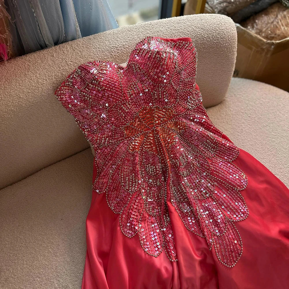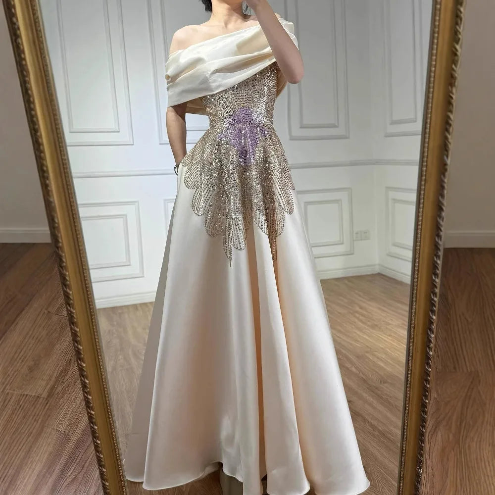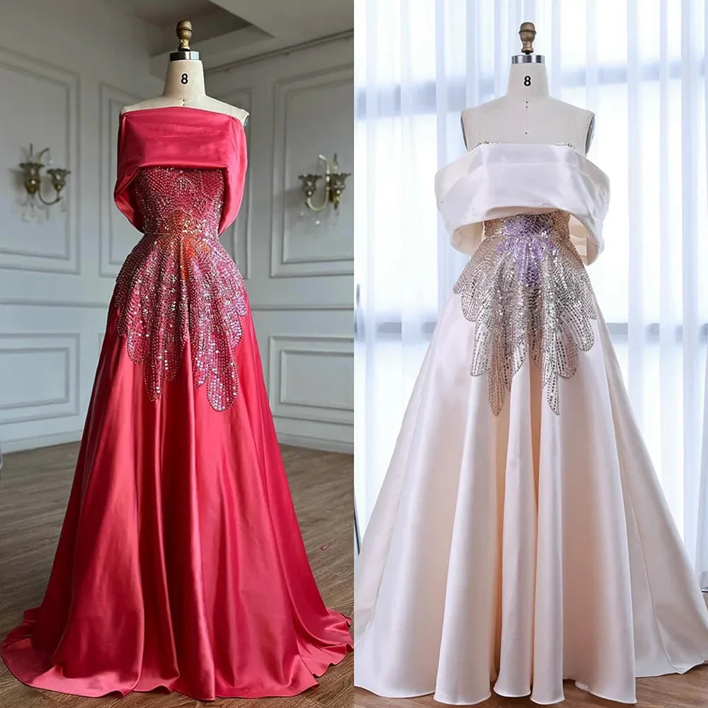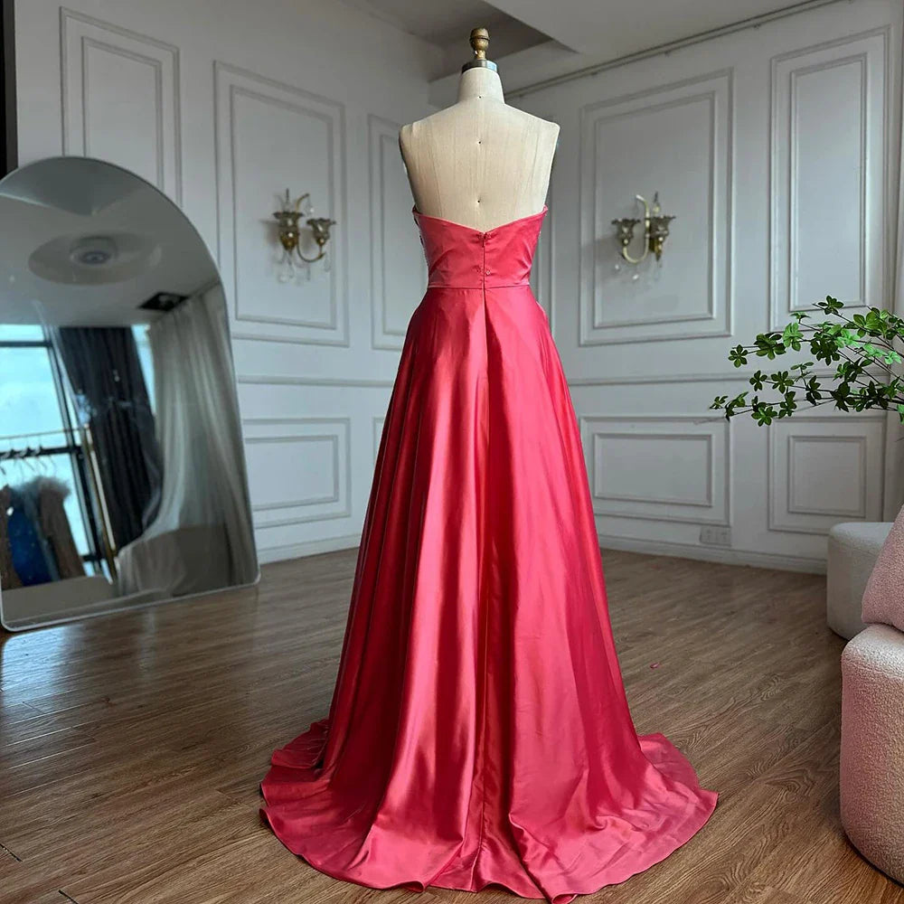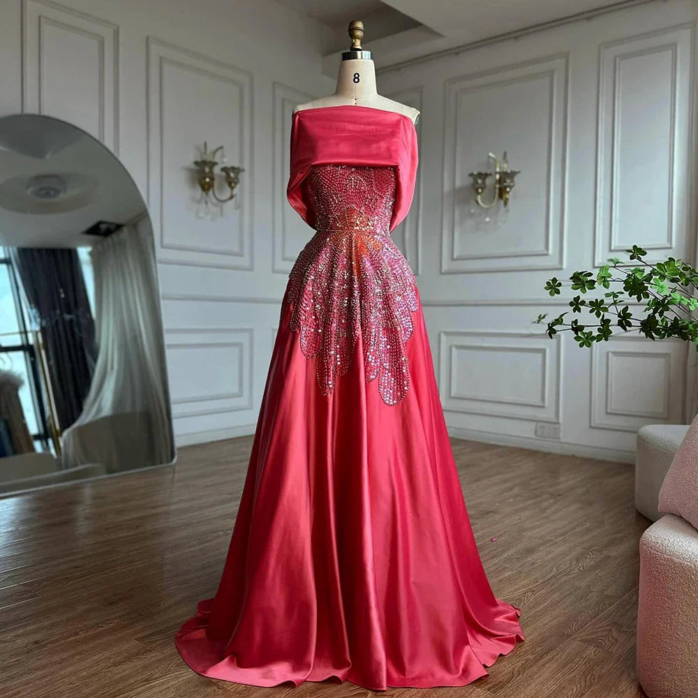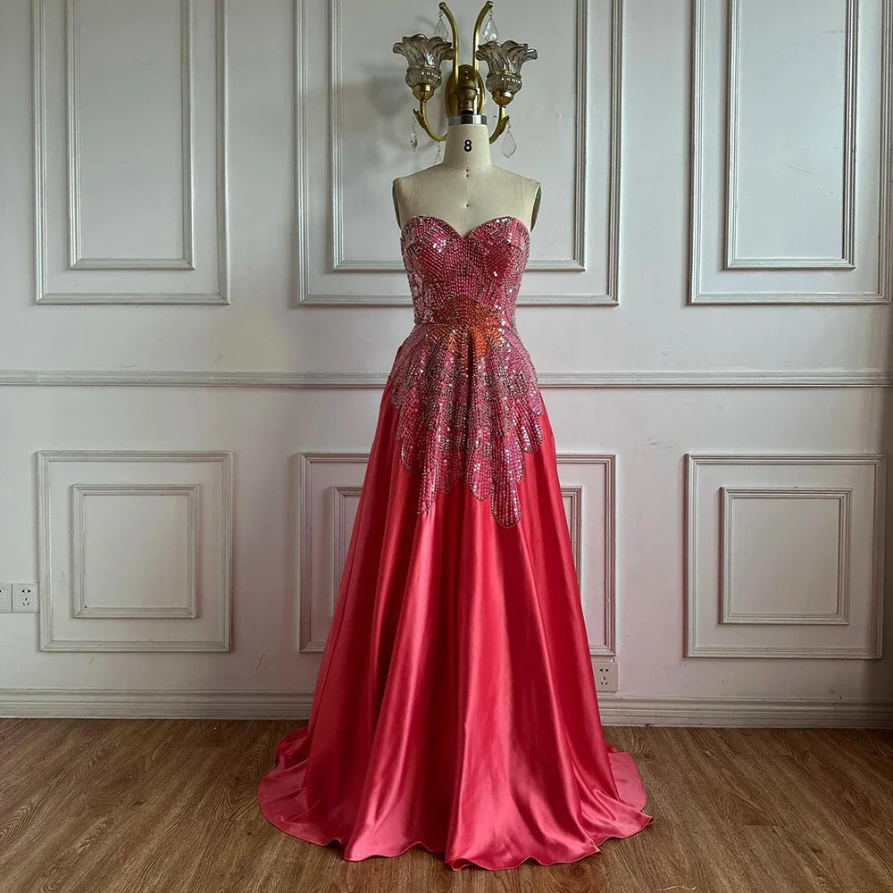 Elegant pink satin A-line evening dress with intricate beading. Perfect for Saudi Arabic formal occasions, weddings, and luxury events. Graceful and refined.