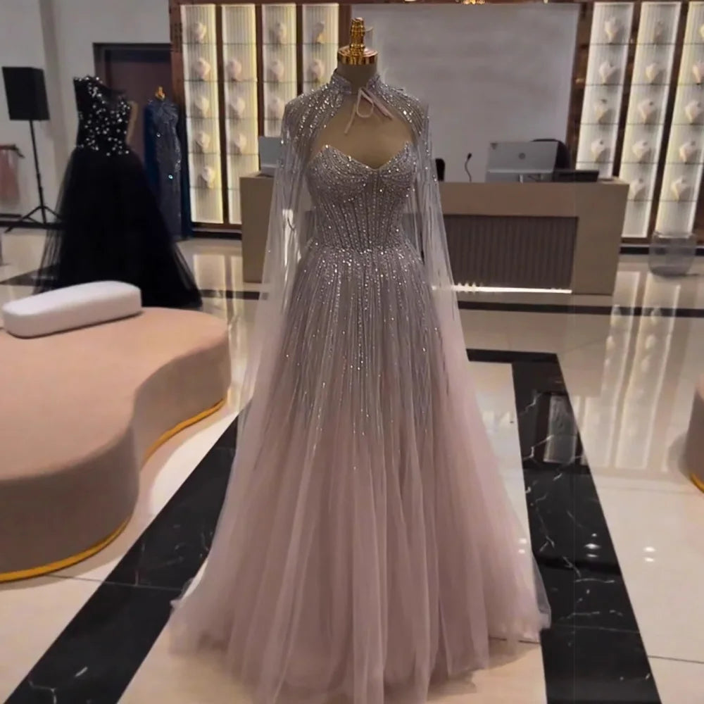 Romantic pink strapless tulle evening dress with beaded details and long cape. A dreamy A-line silhouette perfect for galas and formal parties.