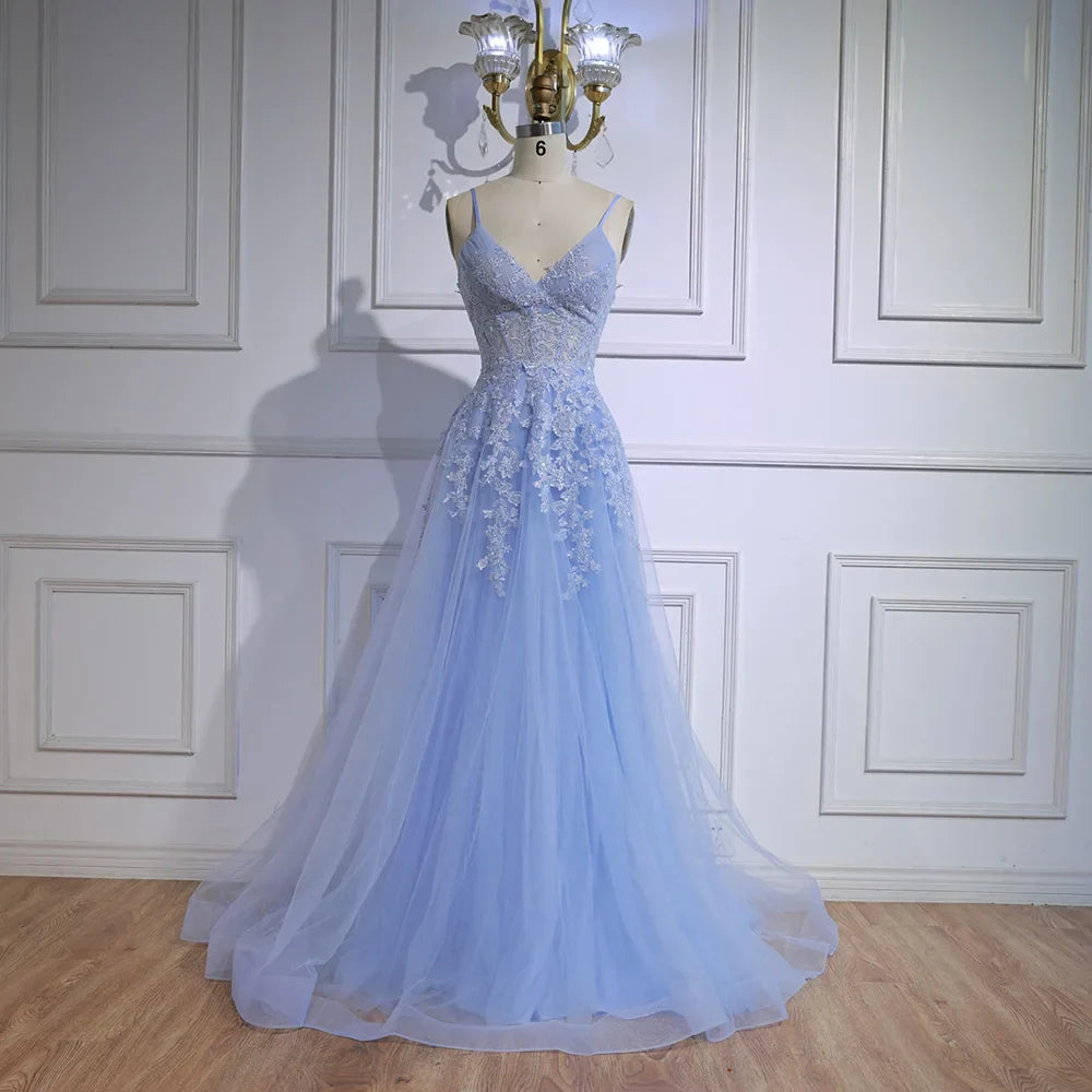 Elegant pink tulle A-line prom dress with delicate appliques and spaghetti straps. A perfect choice for formal parties and special occasions.