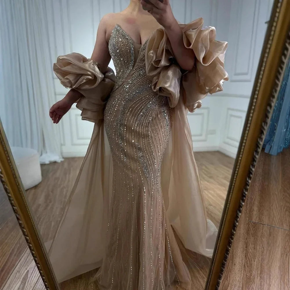 Stunning red Strapless mermaid evening dress with beaded bodice and cape sleeves. A glamorous look for formal occasions, galas, or wedding parties.