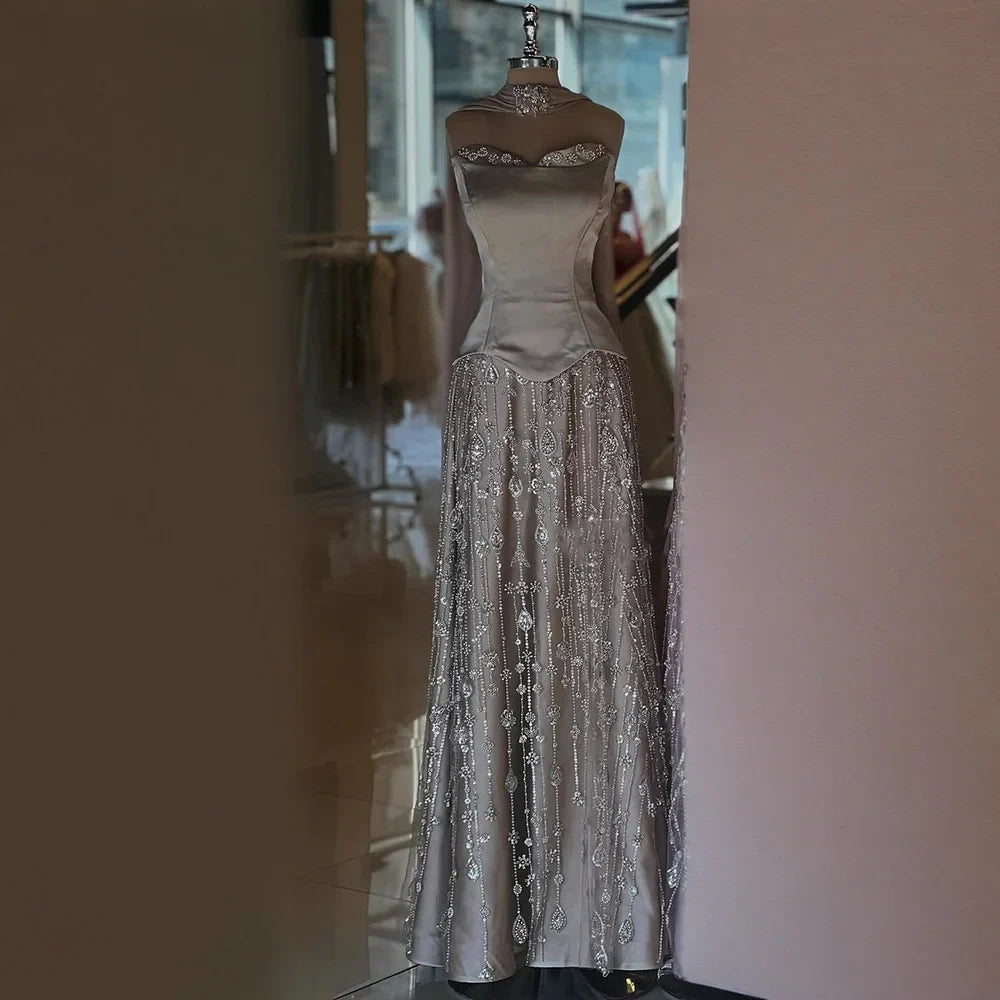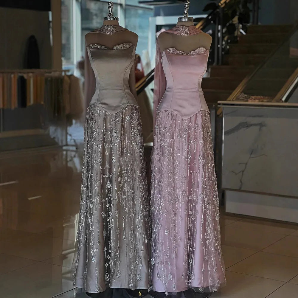 Luxury strapless evening dress LA72805D in sage green and pink. Elegant beaded Arabic gown designed for weddings, parties, and formal occasions.