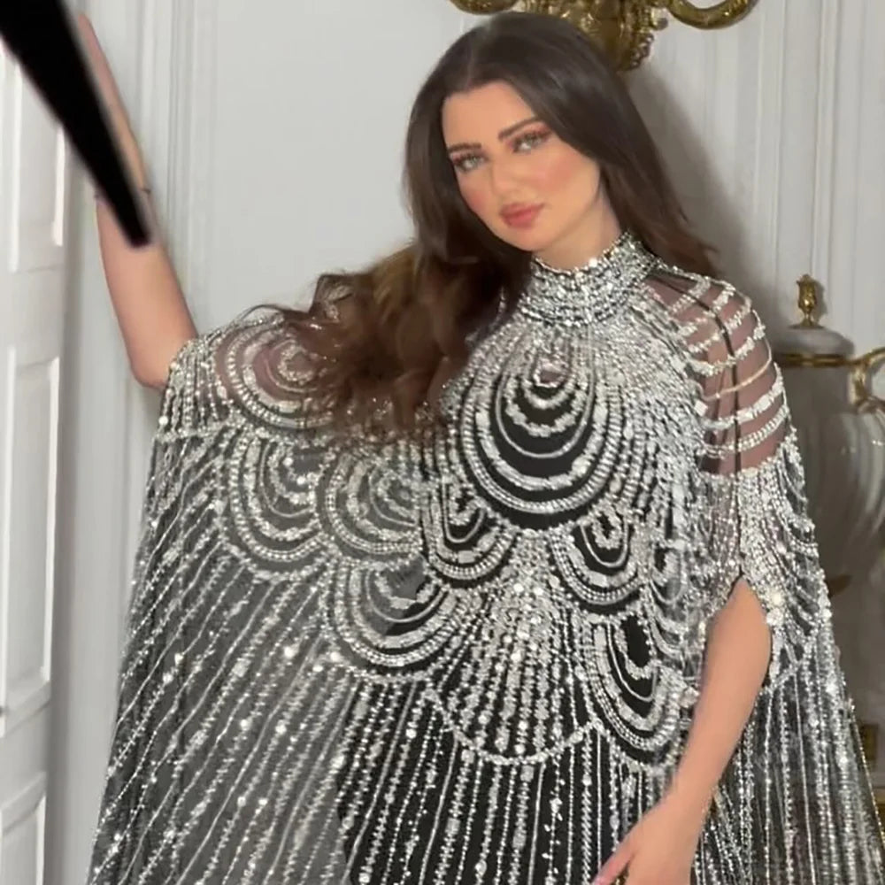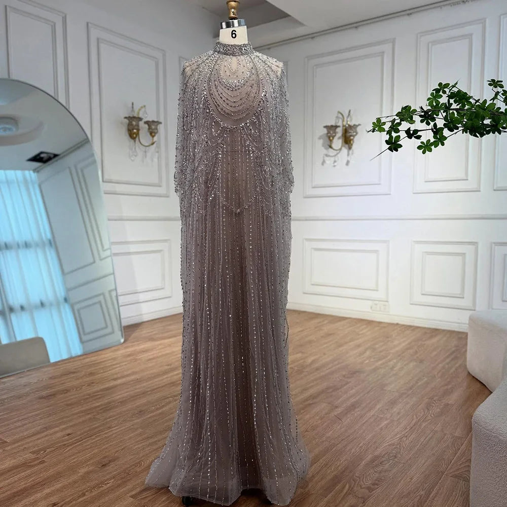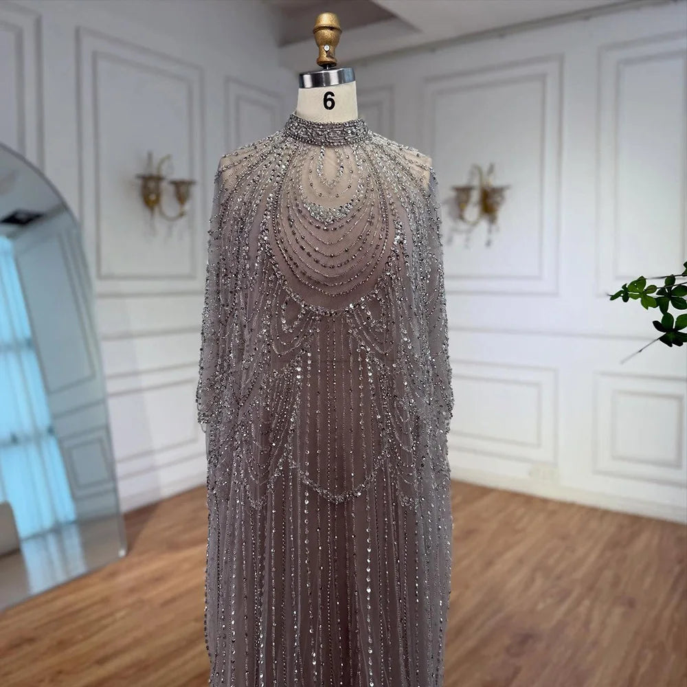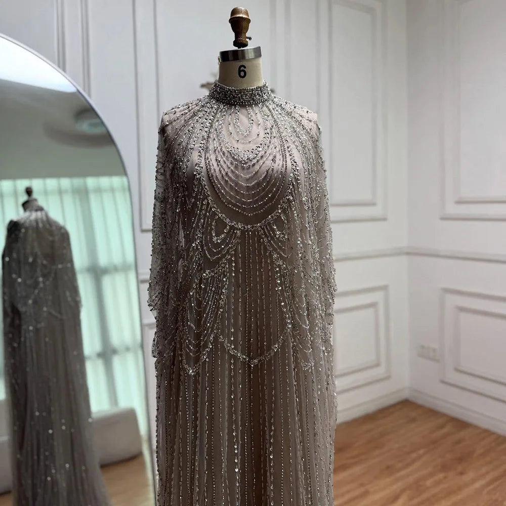 luxury silver nude mermaid gown with cape. Arabic-inspired beaded design for weddings and formal events. Elegant and custom-made. LA72484A.
