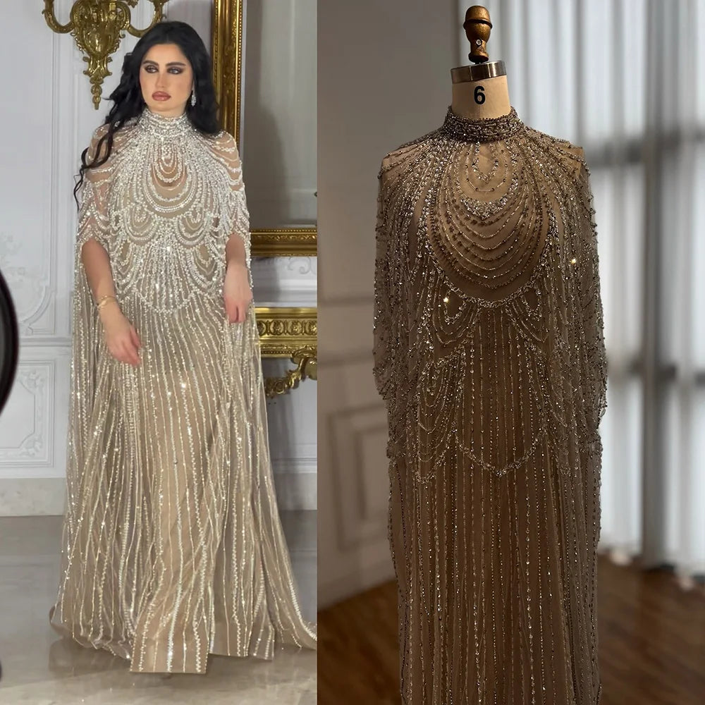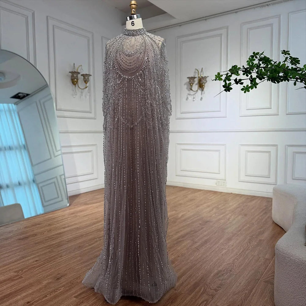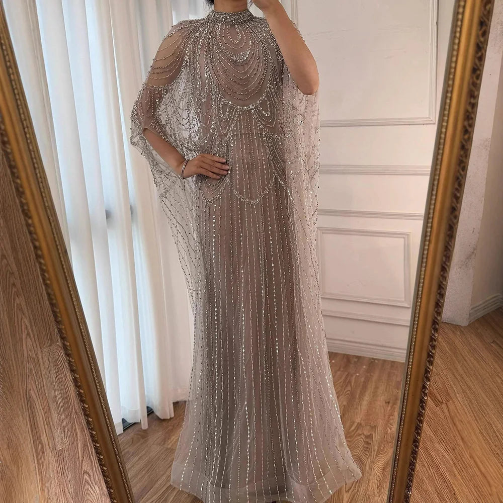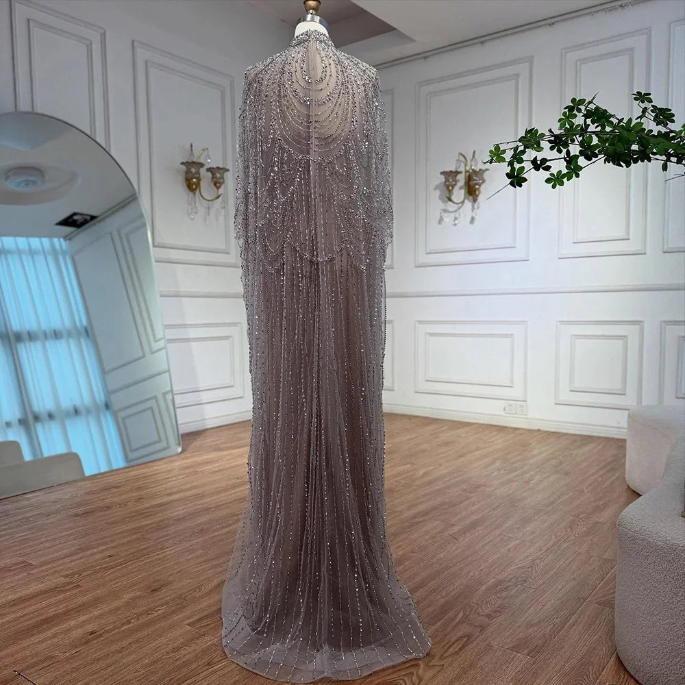 Luxury Silver Nude Beaded Mermaid Evening Dress with Cape LA72484A