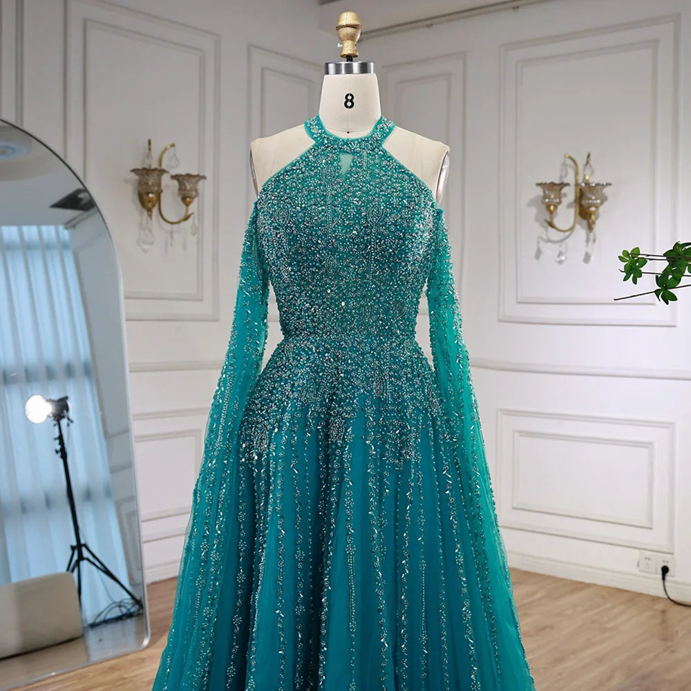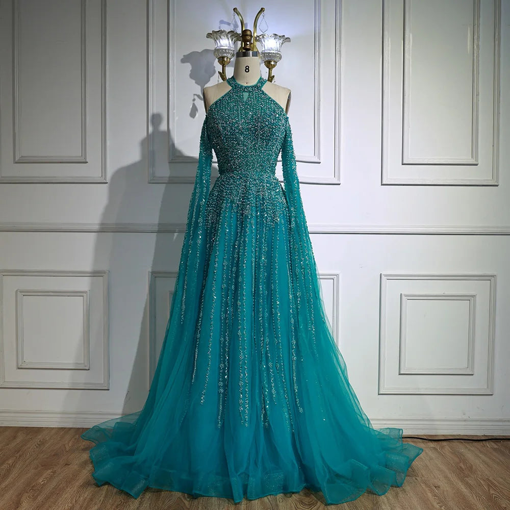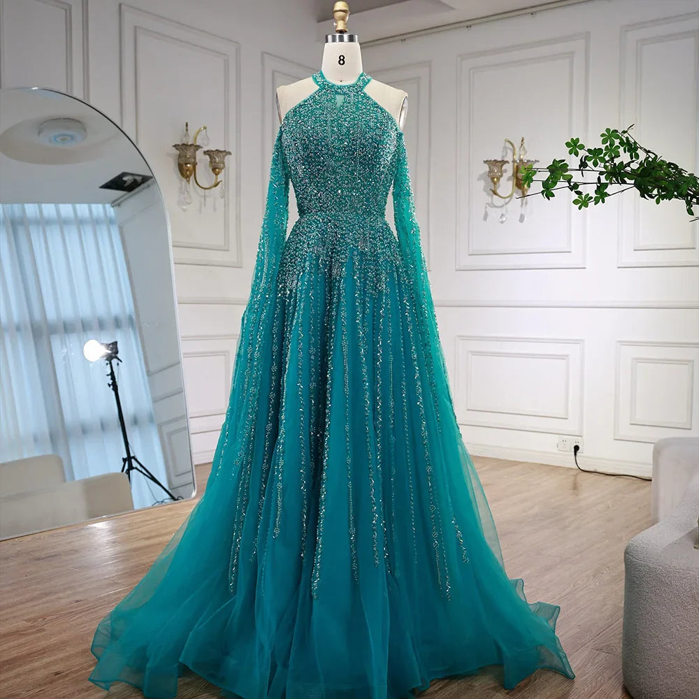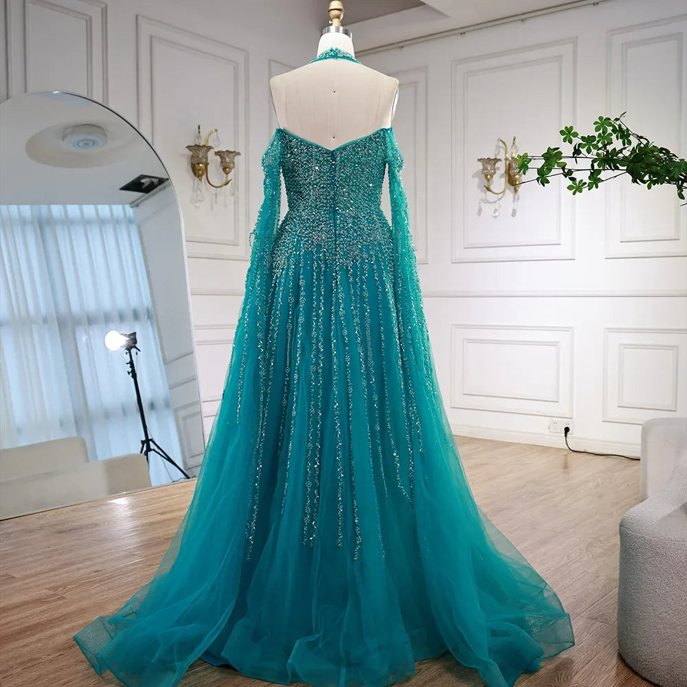 Elegant turquoise A-line evening dress with sparkling beads and cape sleeves. Perfect for formal occasions and Arabic-inspired events.
