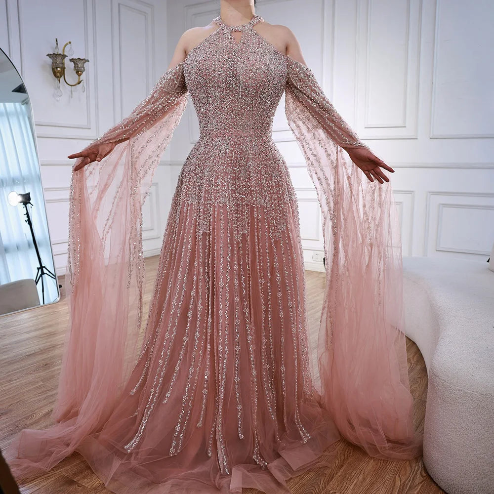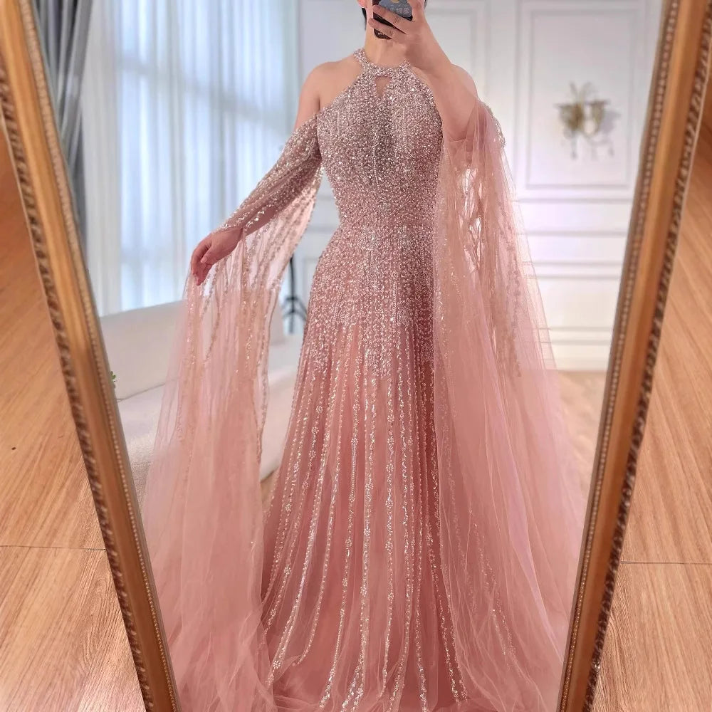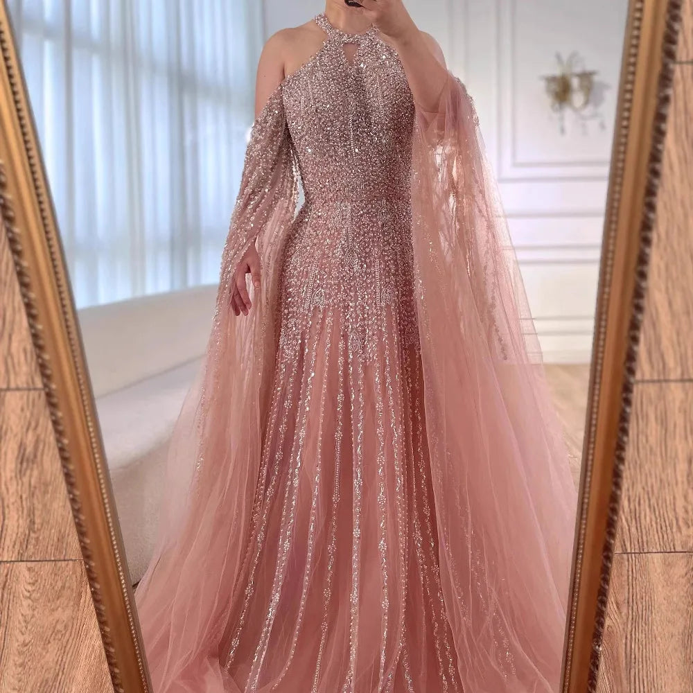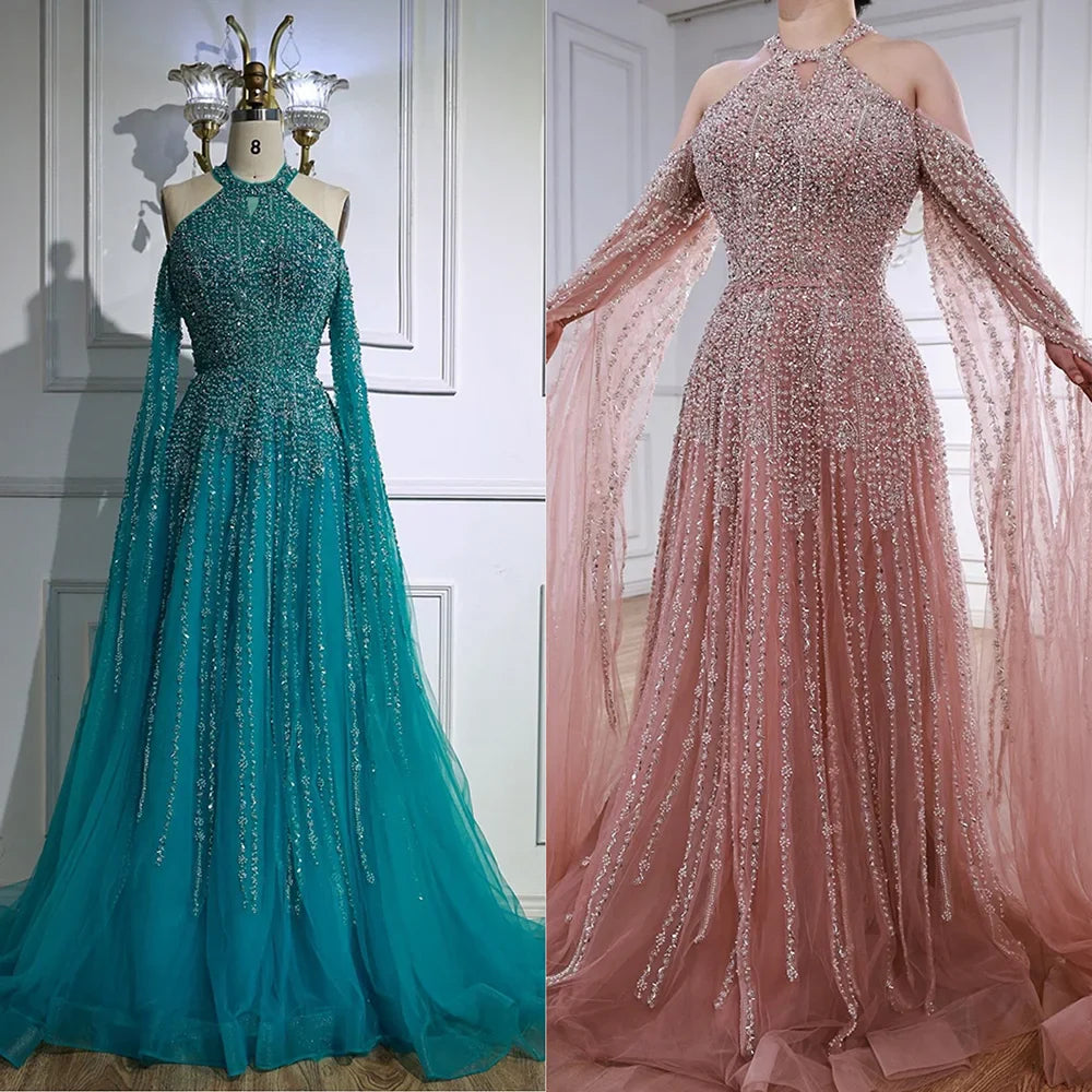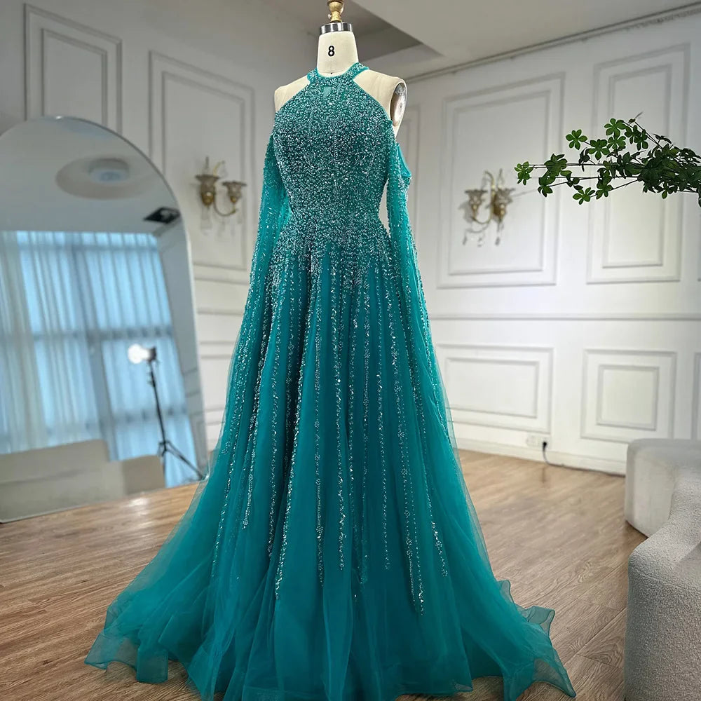 Elegant turquoise A-line evening dress with sparkling beads and cape sleeves. Perfect for formal occasions and Arabic-inspired events.