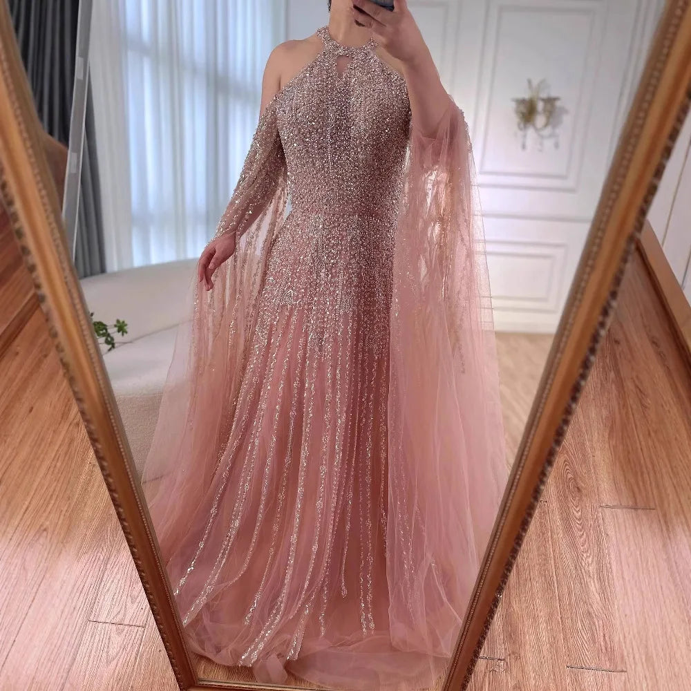 Luxury Turquoise Beaded A Line Evening Dress with Cape Sleeves LA72820