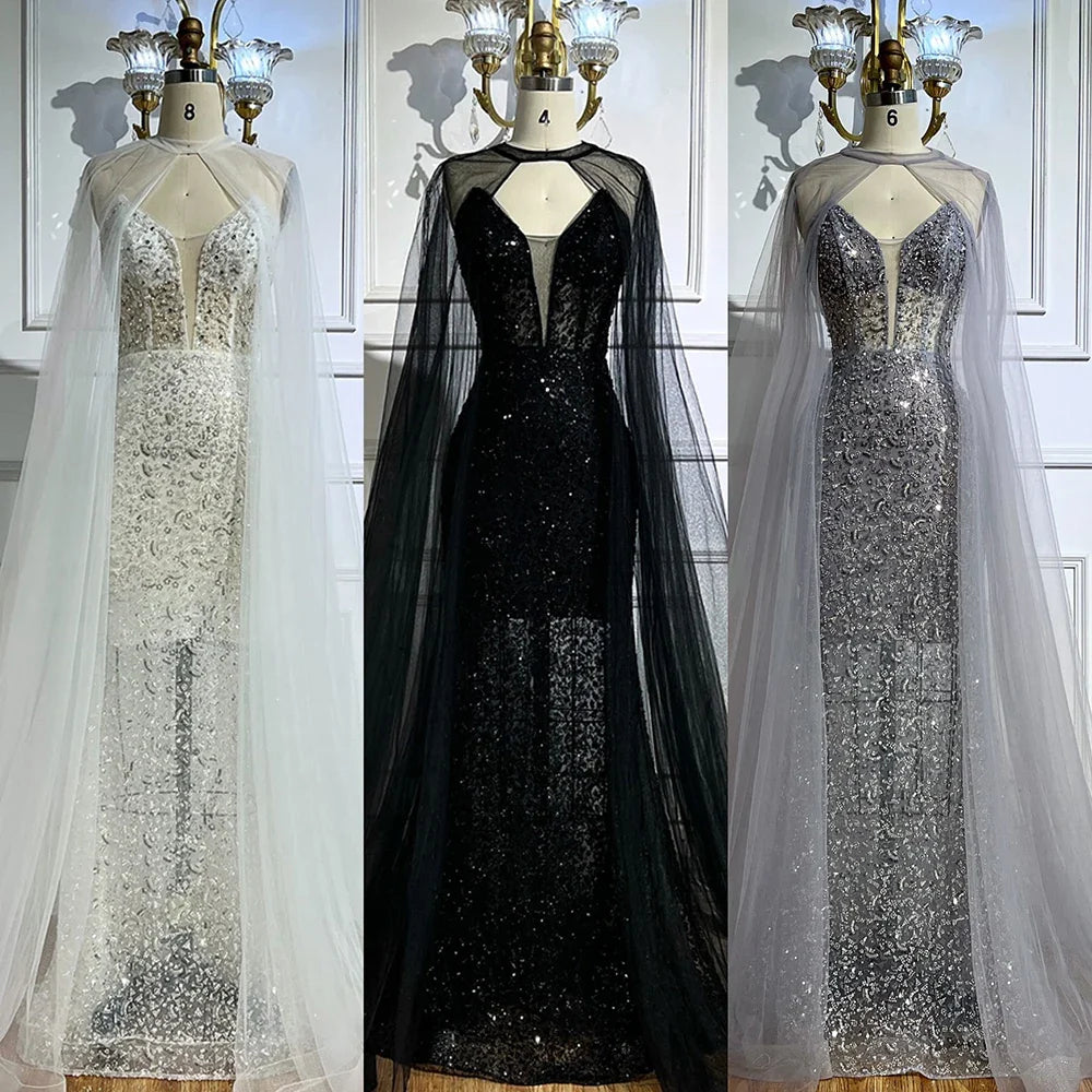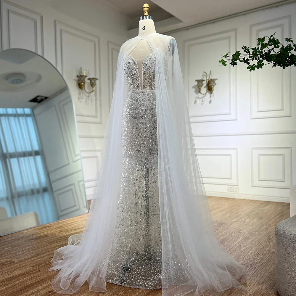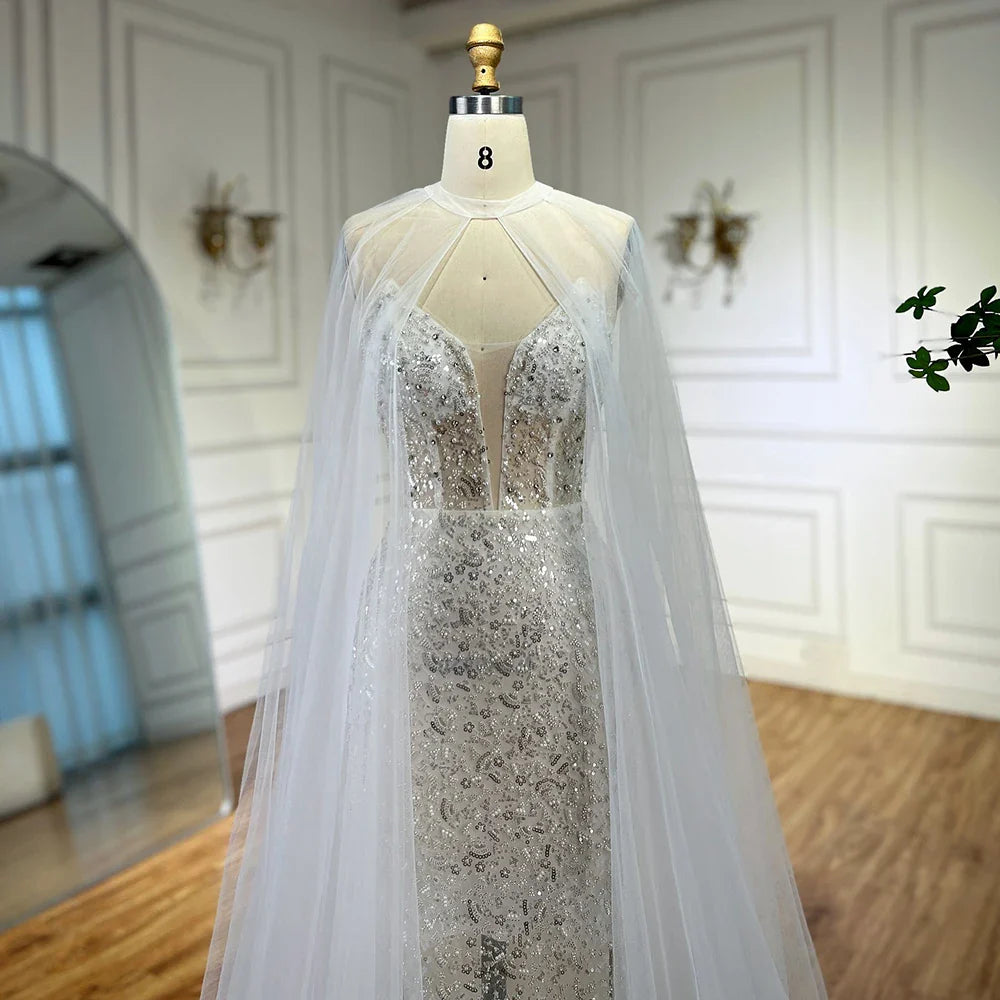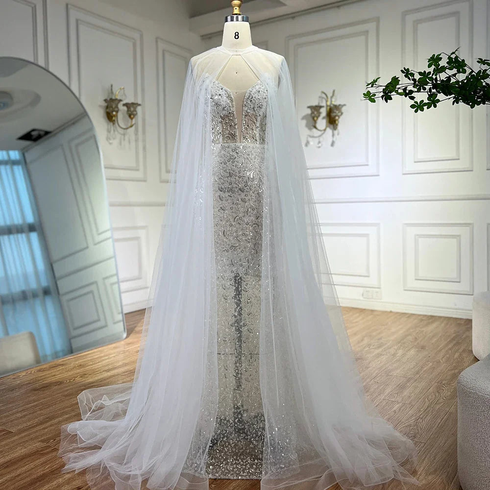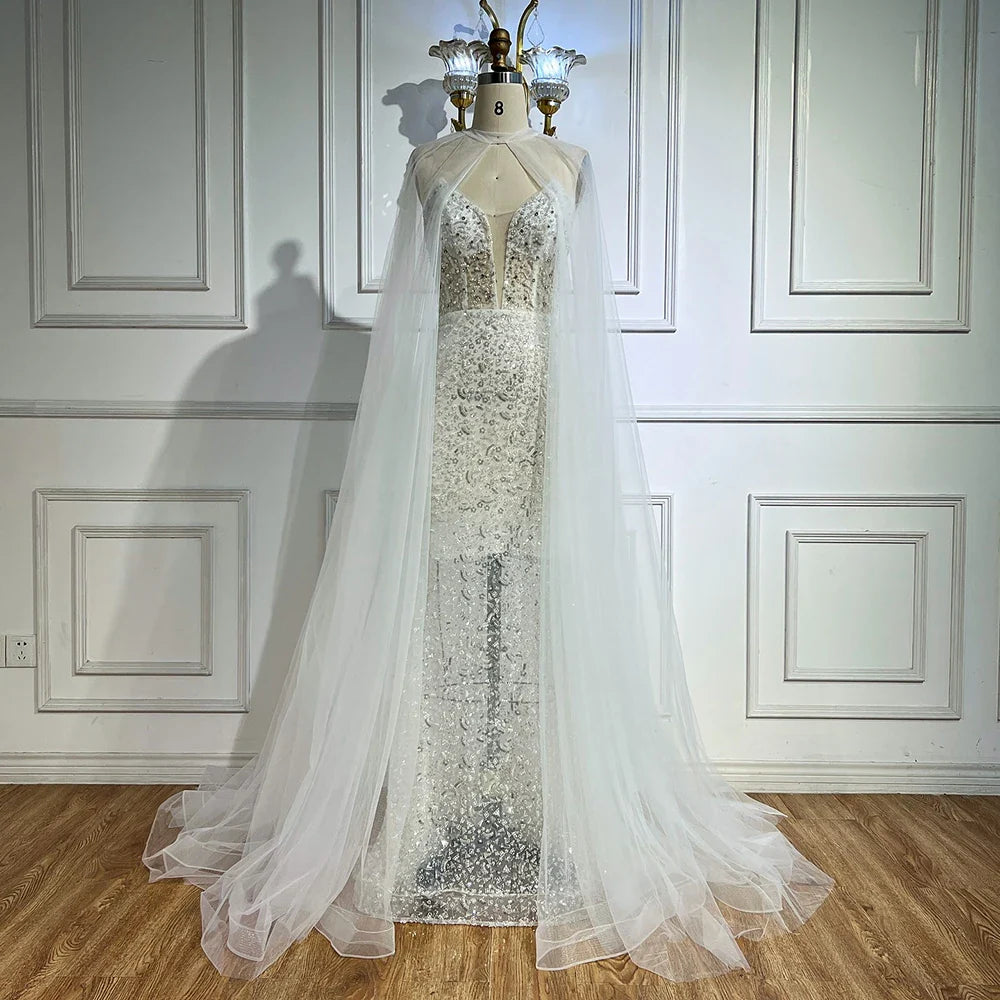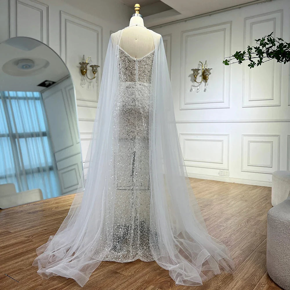 Luxury White Sequin Mermaid Evening Dress with Cape LA72996