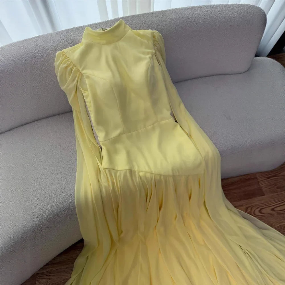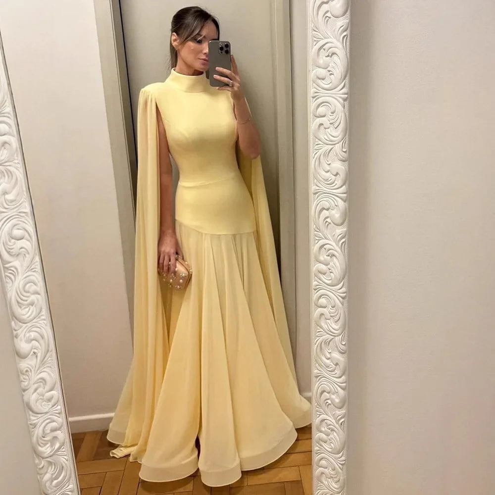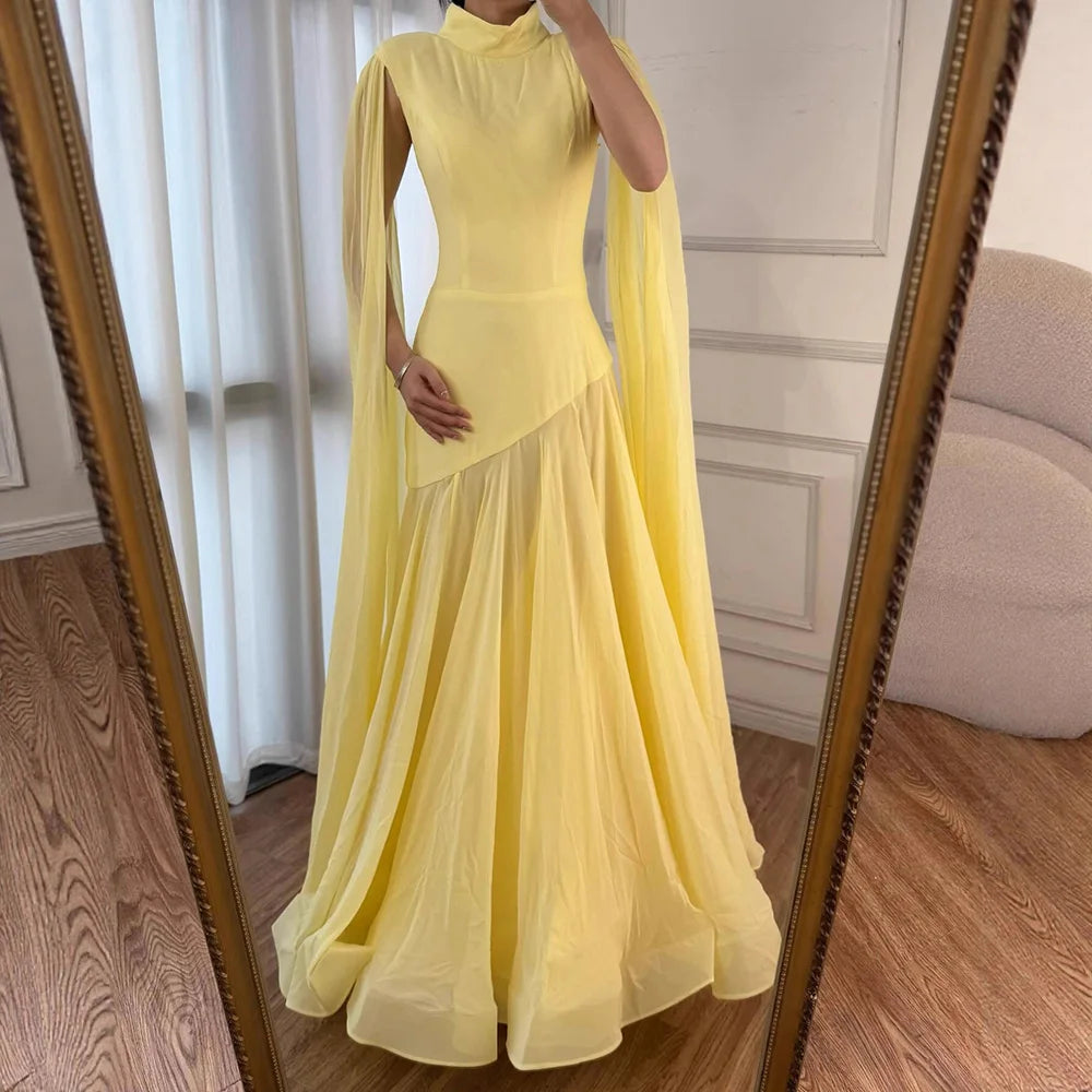 Elegant yellow chiffon A-line evening gown with high neck and flowing cape sleeves. Ideal for formal parties, weddings, or red-carpet events.