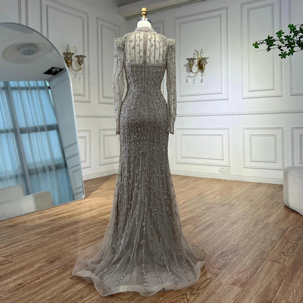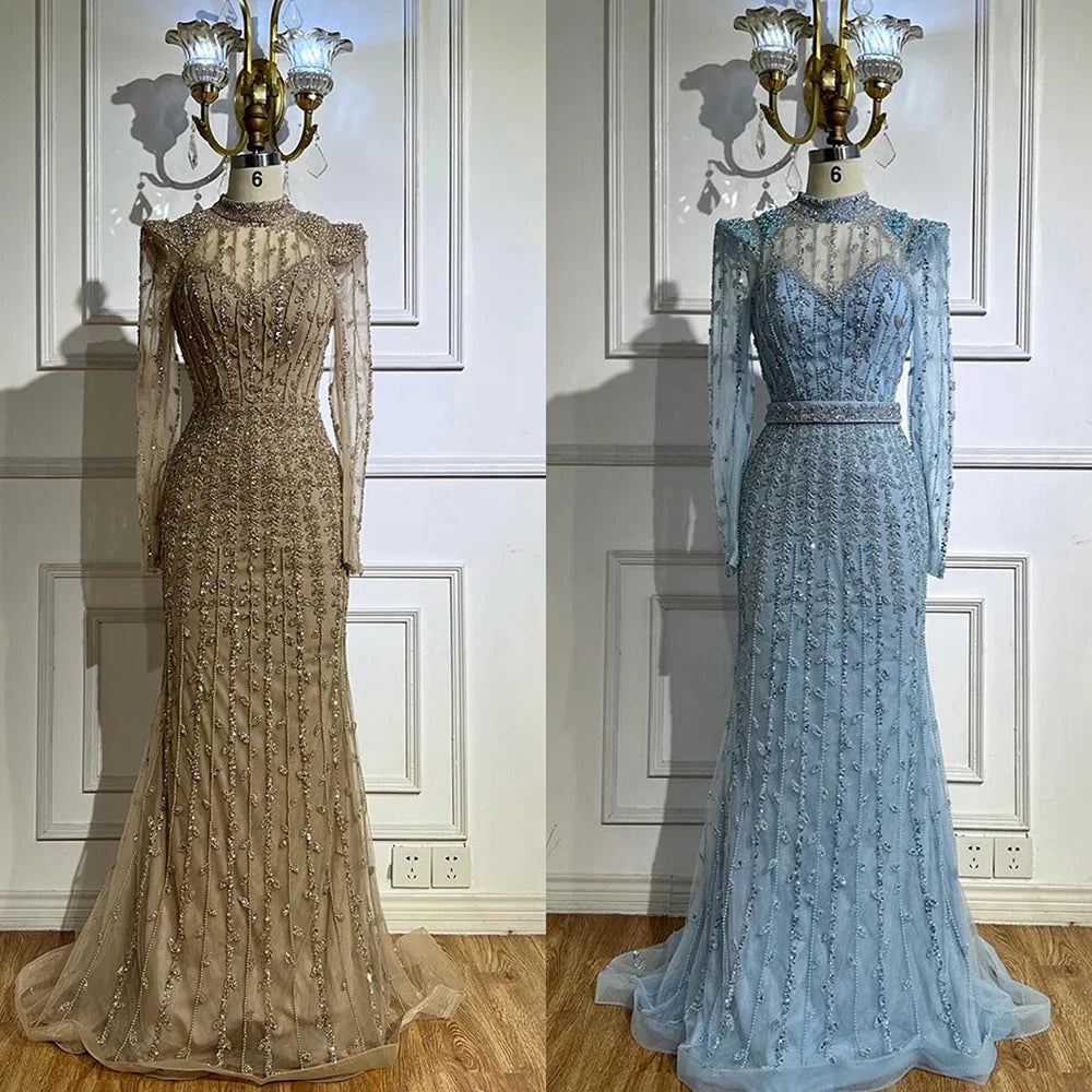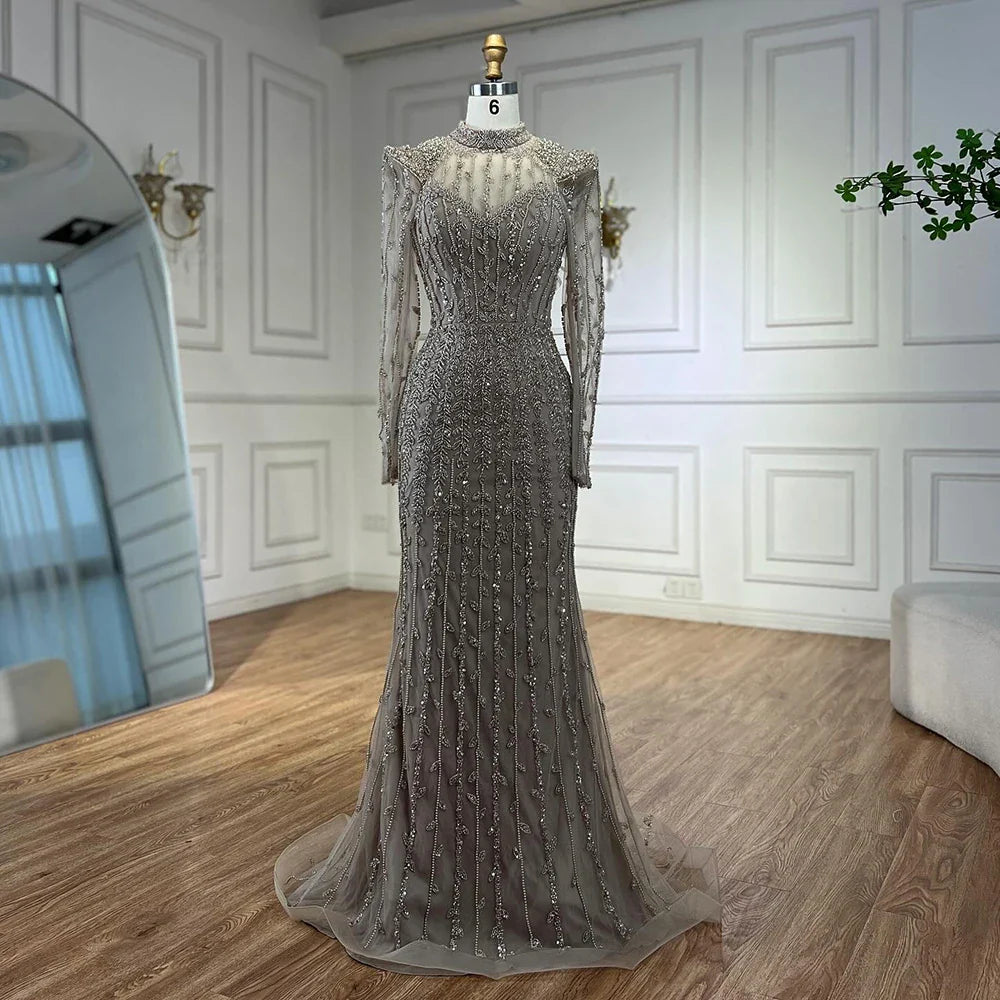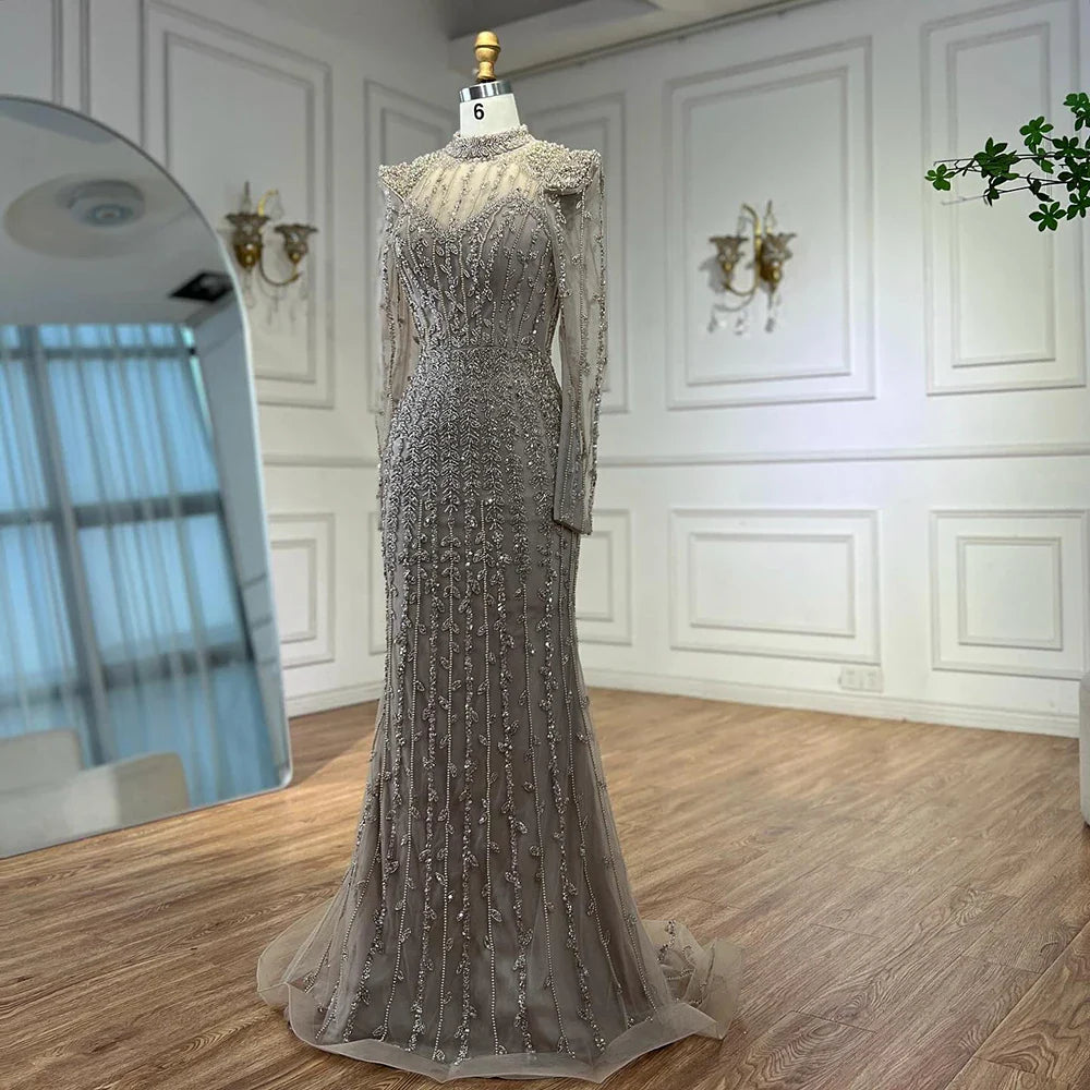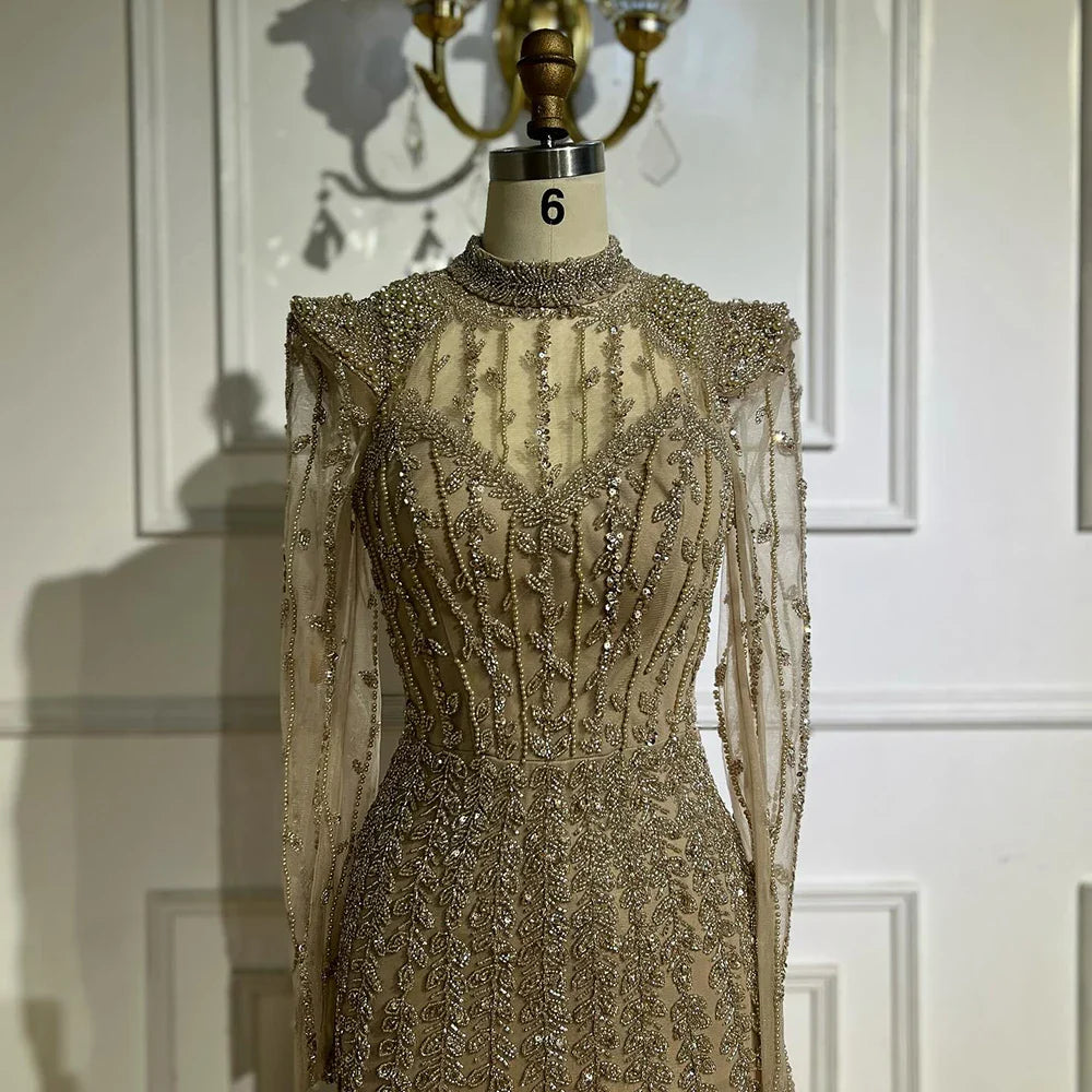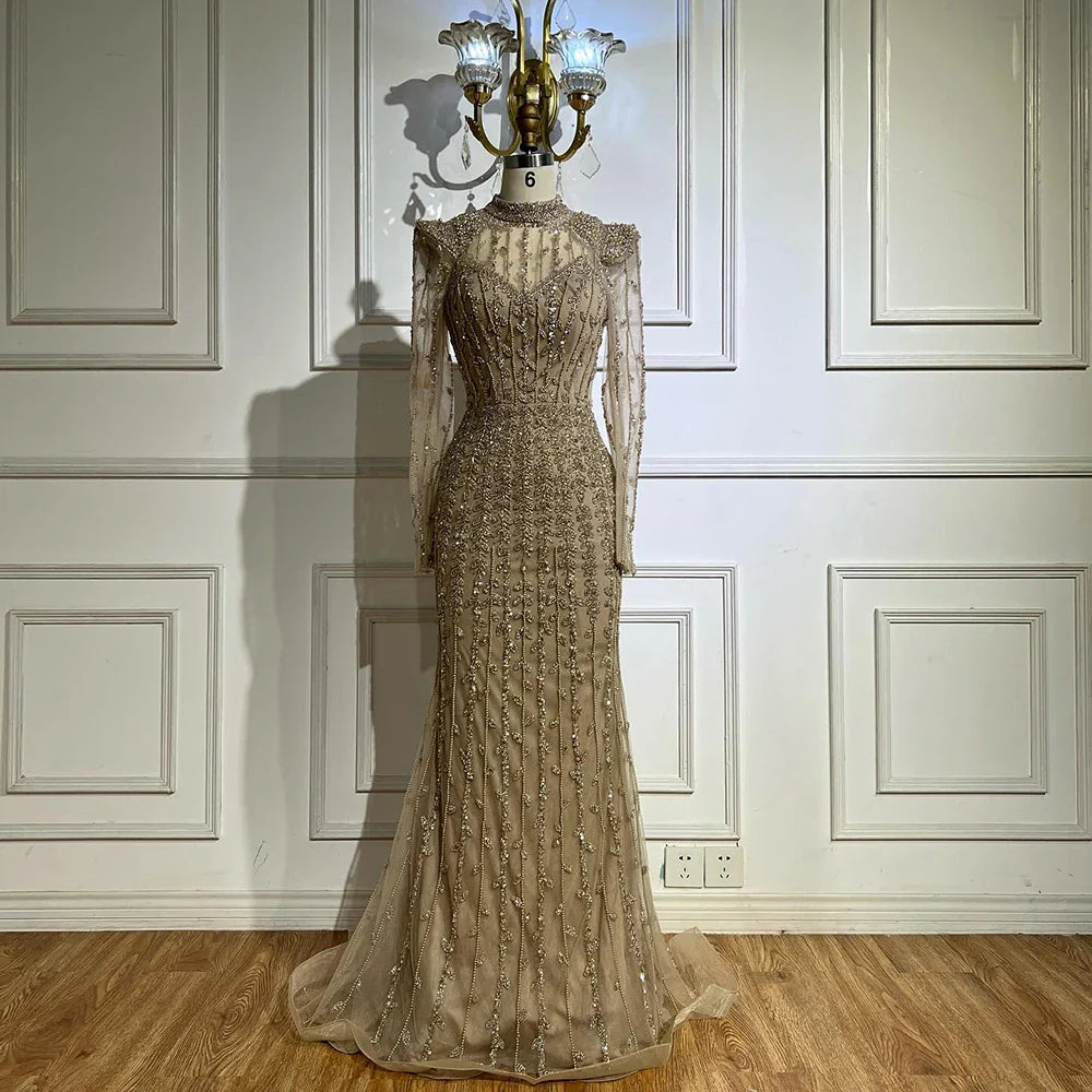 Embrace understated glamour in this modest caramel mermaid gown with long sleeves and sleek contouring—crafted for elegance and available in two refined shades.