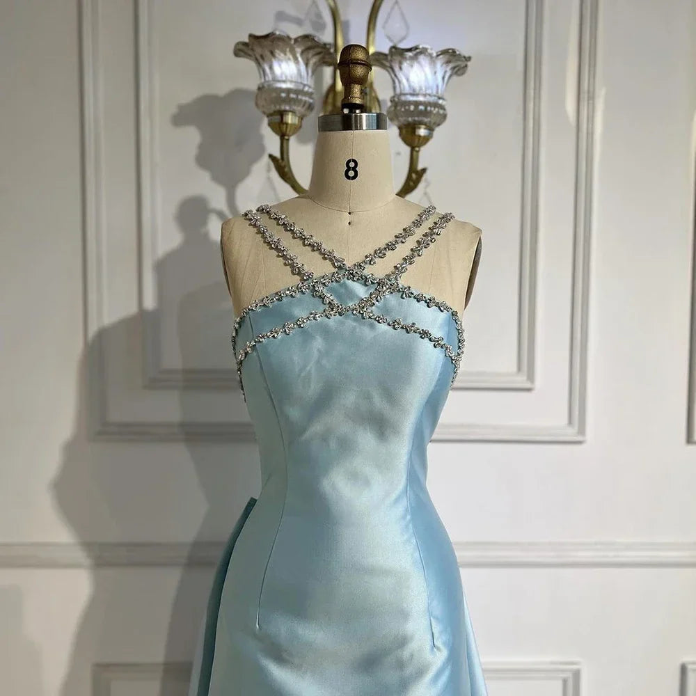 Elegant Light Blue Satin Arabic Evening Dress with Overskirt LA72524