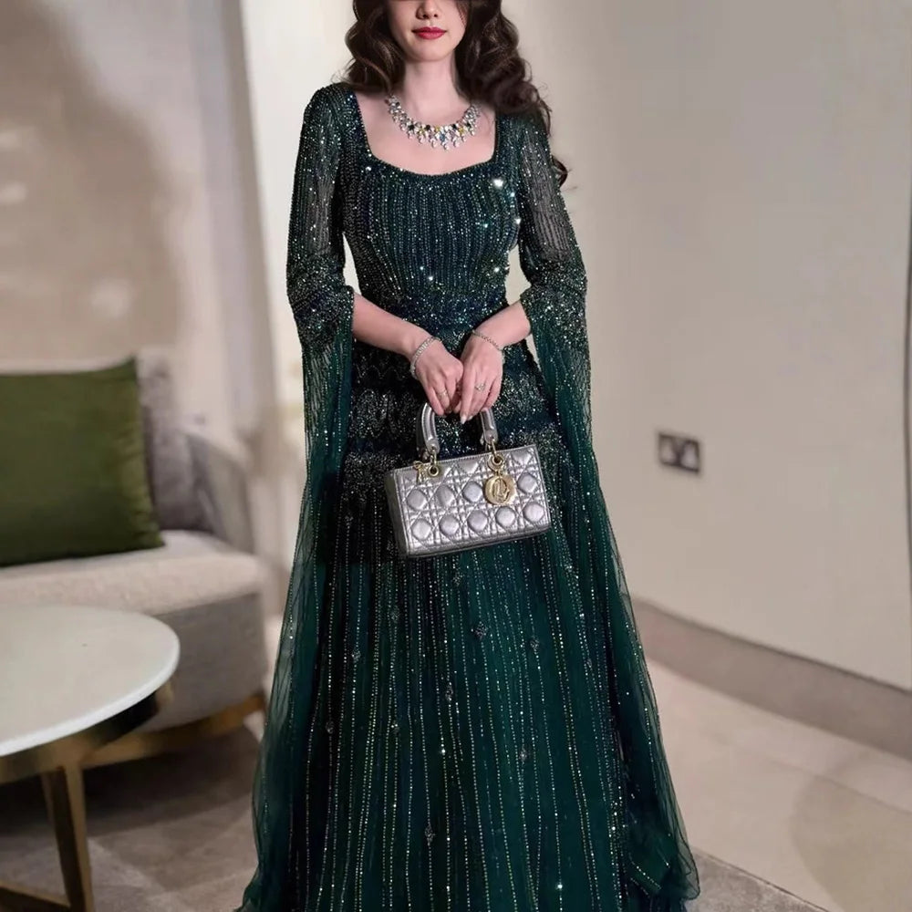 Elegant caramel A-line evening dress with flowing beaded cape sleeves. A perfect choice for weddings, red carpet events, and formal occasions.