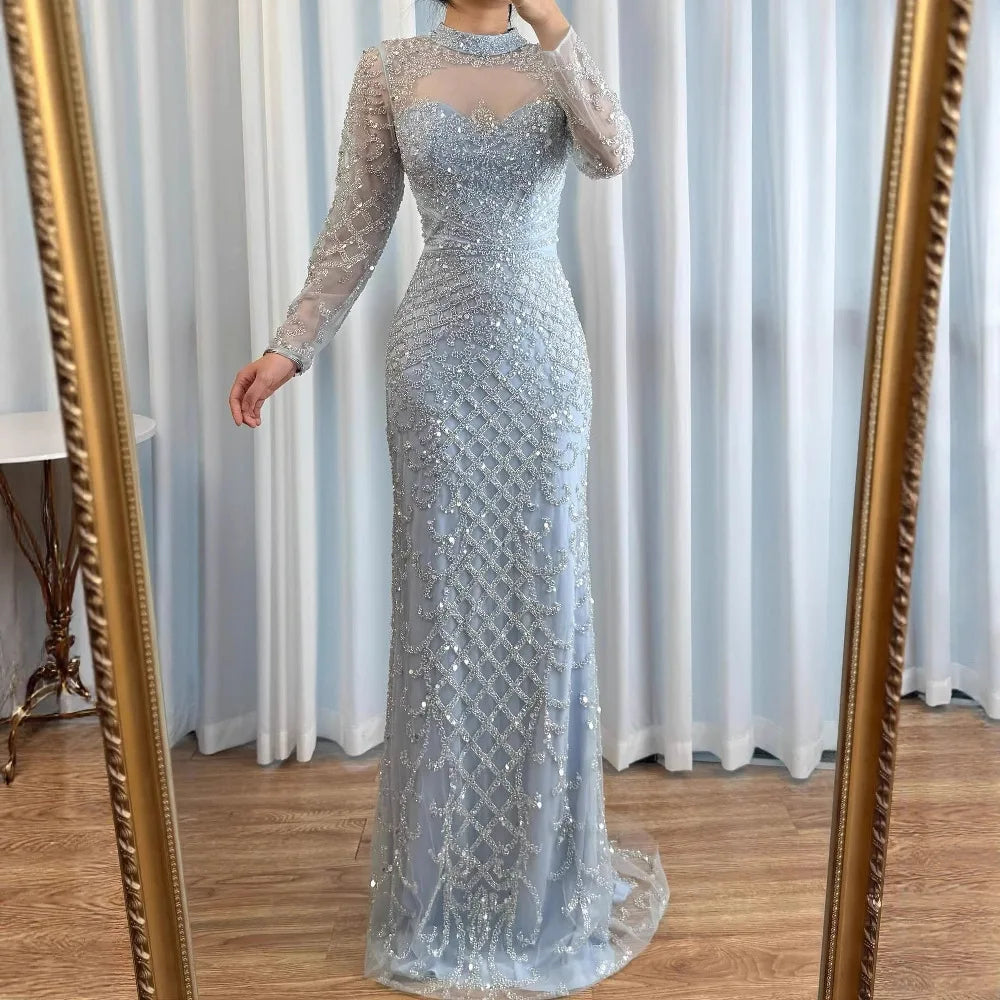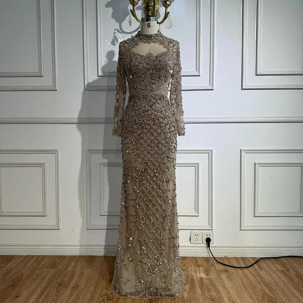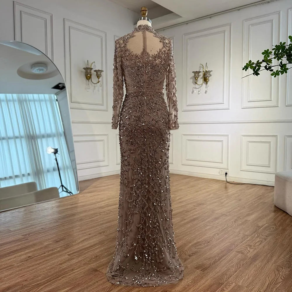This caramel mermaid evening dress features a high neck, long sleeves, and shimmering beading. Available in plus sizes—perfect for elegant formal occasions.
