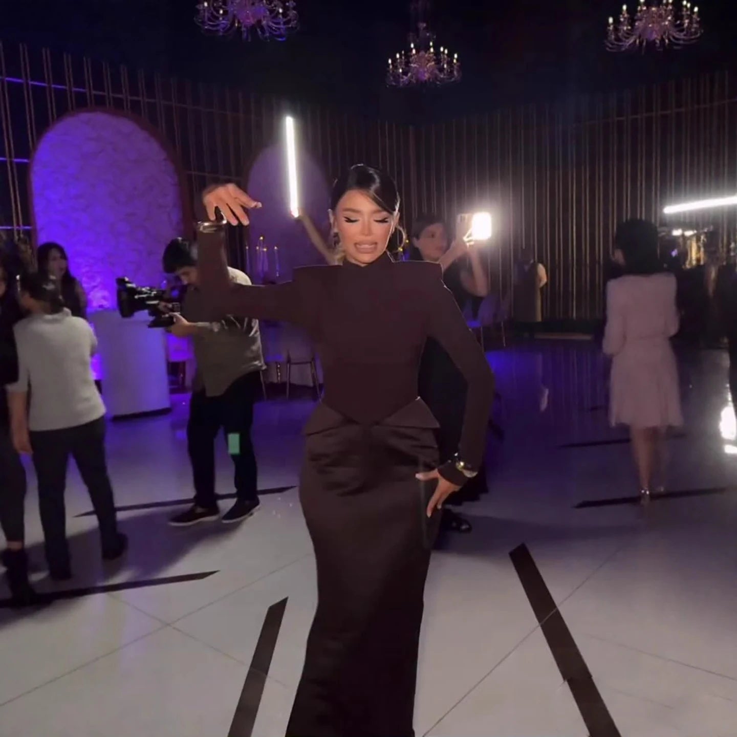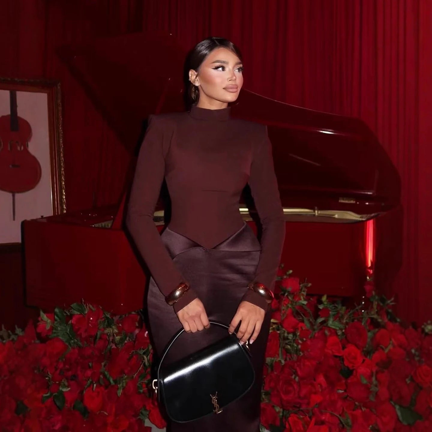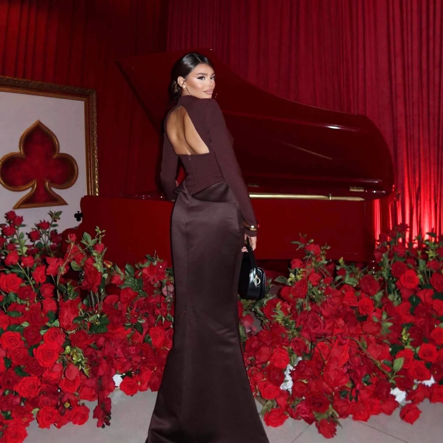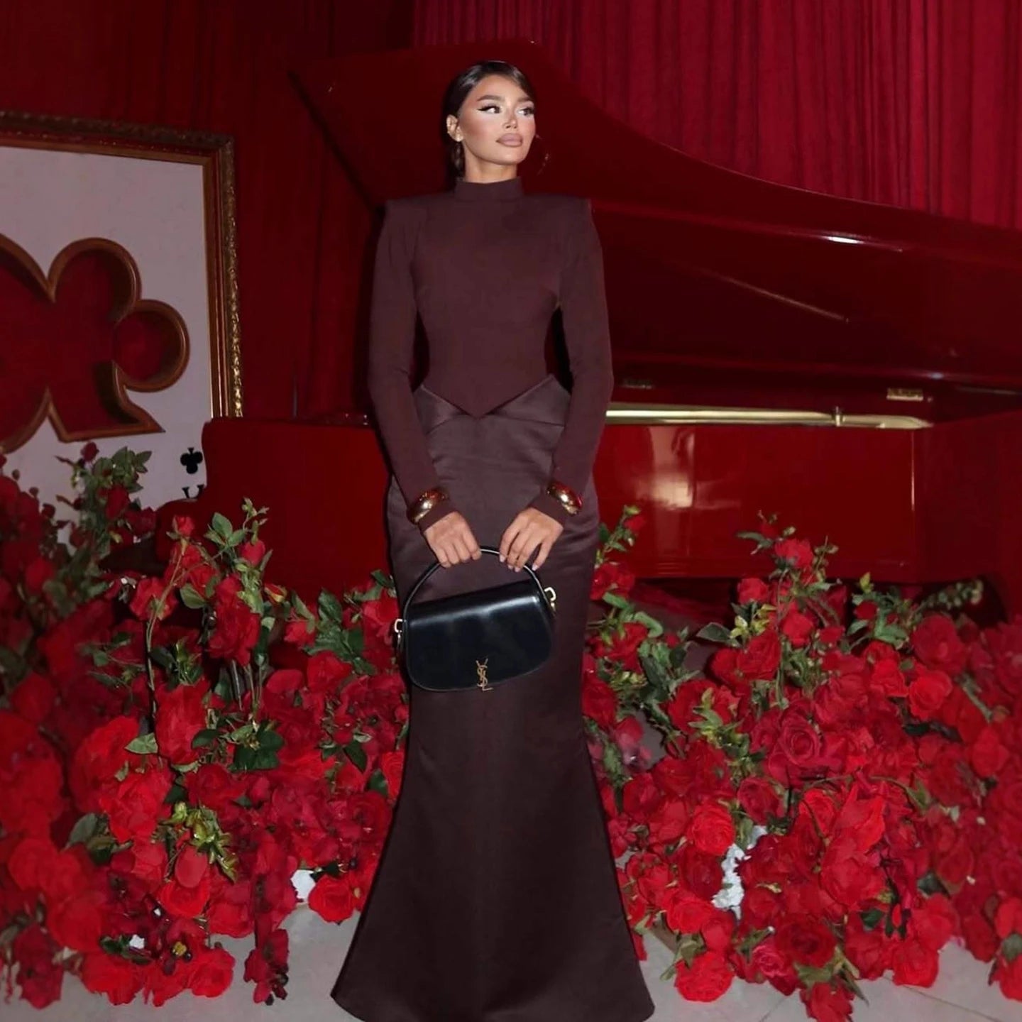 Elegant brown French minimalist mermaid evening dress, ideal for weddings and parties. A chic simple gown that highlights refined modern style.