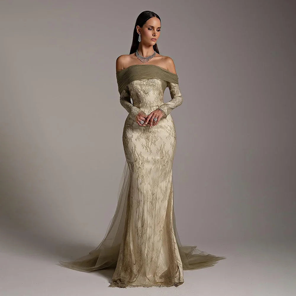Elegant olive green off-shoulder evening dress featuring delicate lace sleeves. Ideal for formal parties, weddings, and special events. Serene Hill 2025.