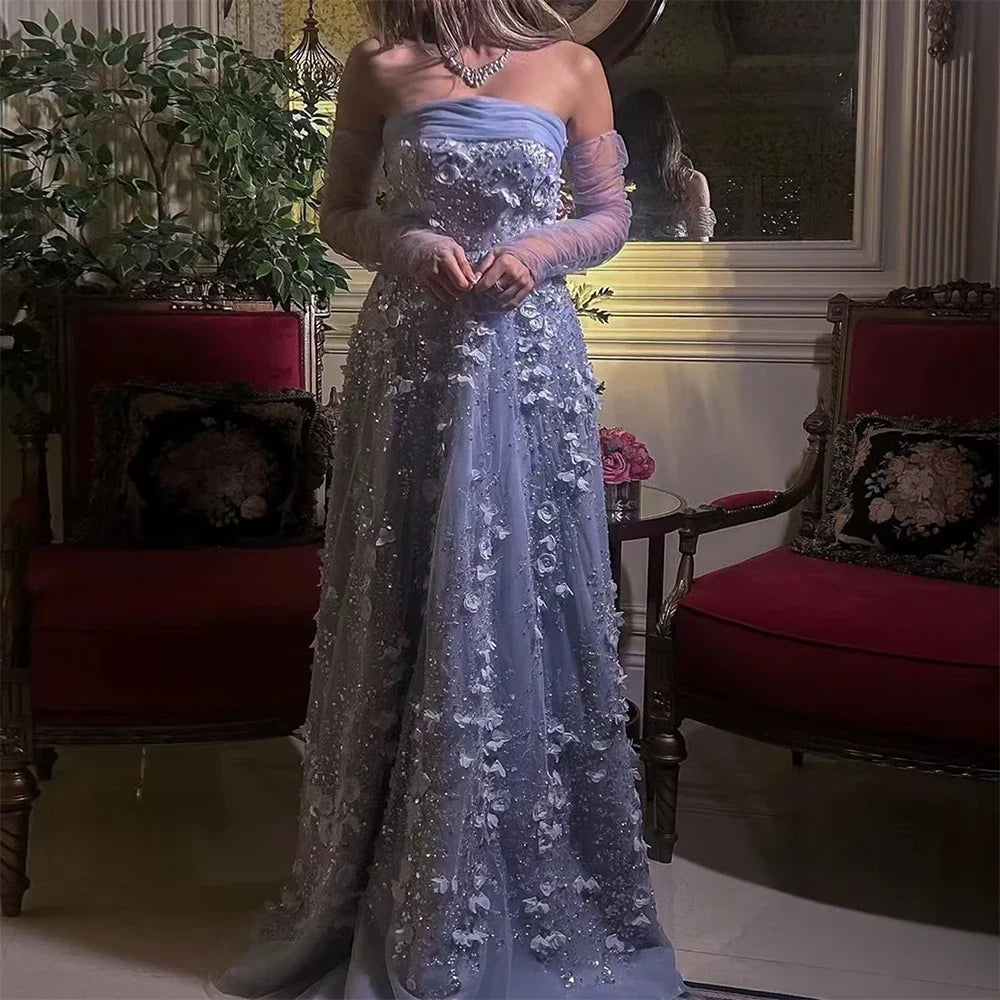 Romantic pink evening dress LA72912 with 3D floral appliques and matching gloves. Perfect for Arabic weddings or elegant formal parties.