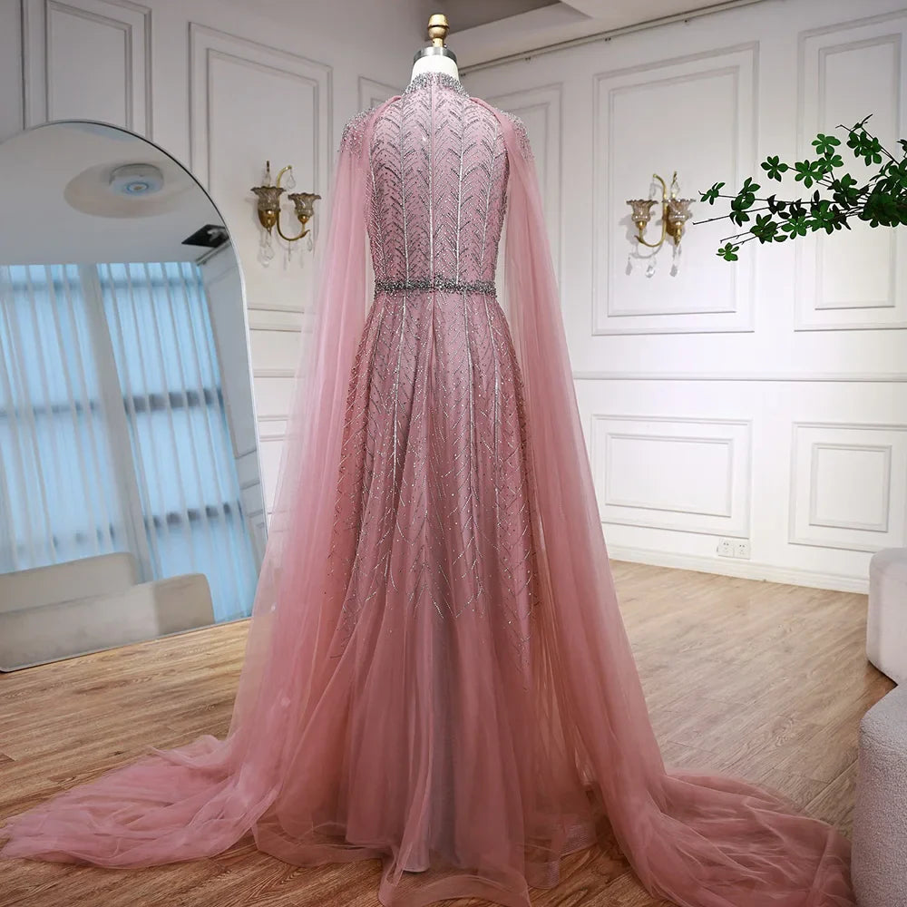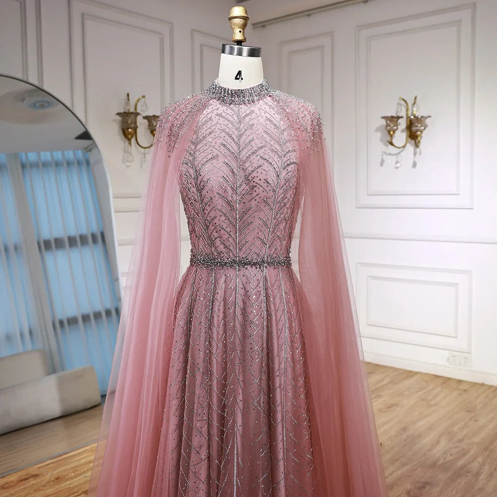 Elegant pink beaded evening dress with flowing cape design, perfect for weddings, galas, and formal events.