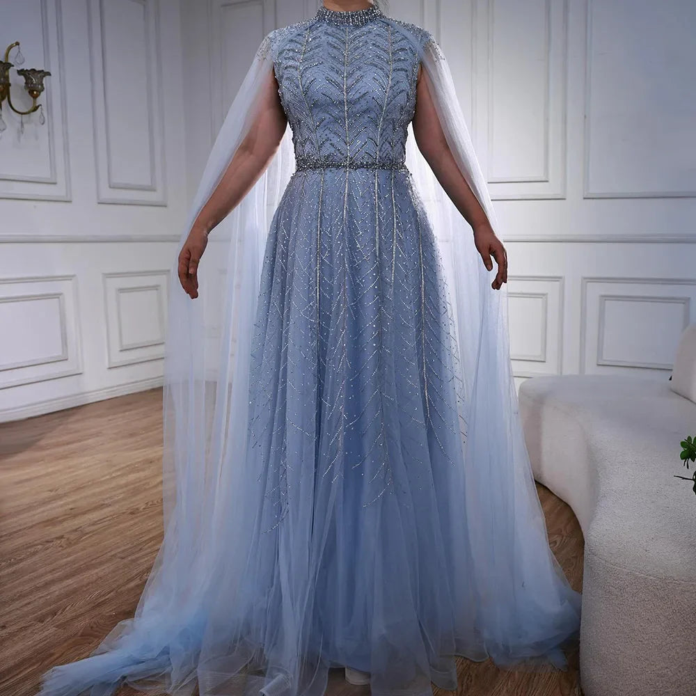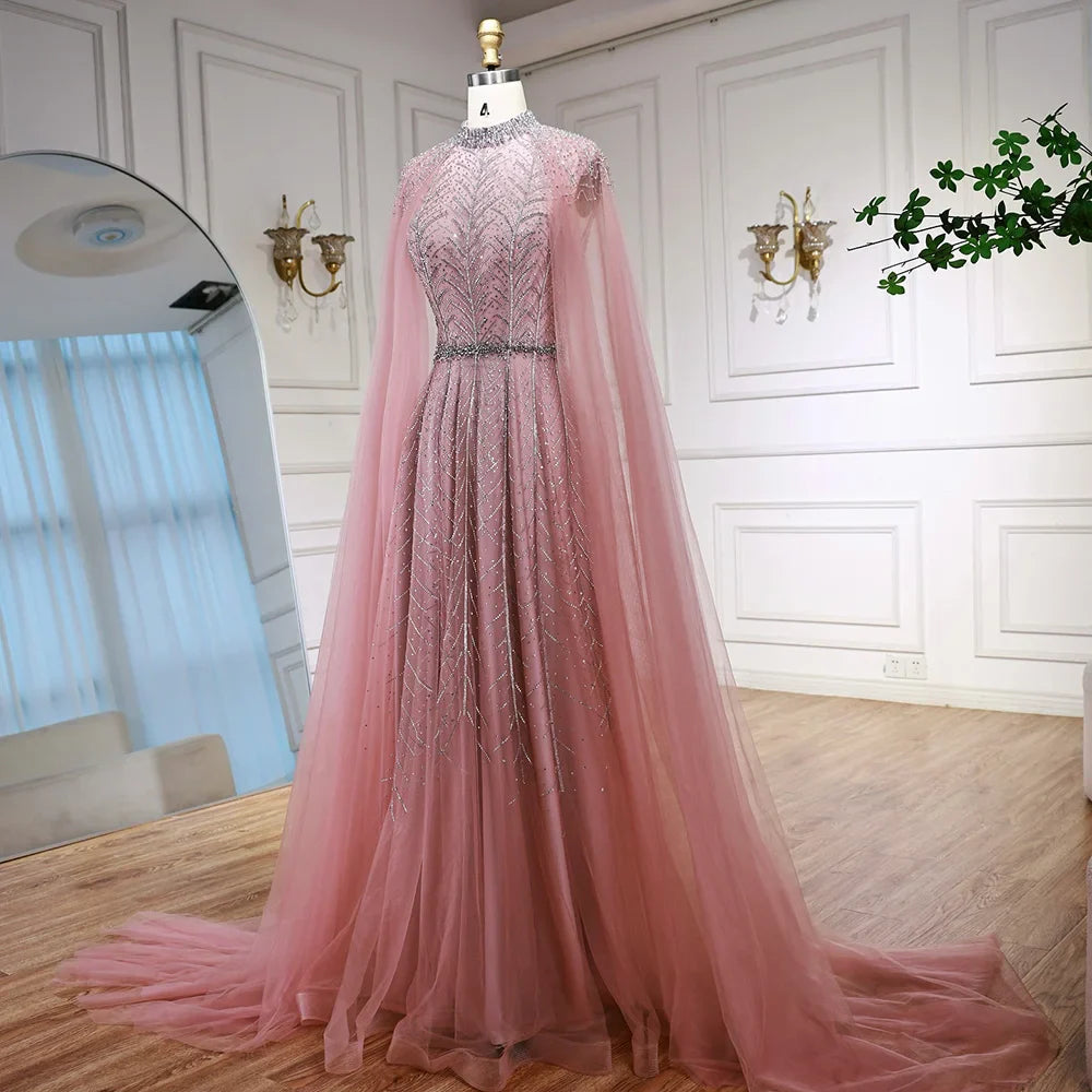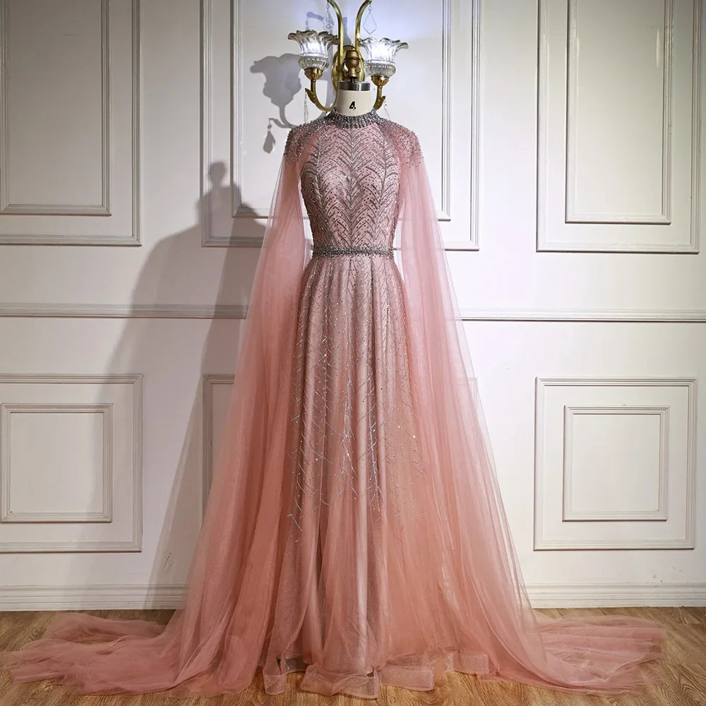 Luxury Elegant Pink Beaded Evening Dress with Cape LA73033