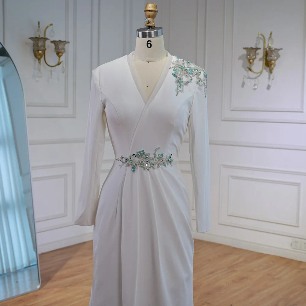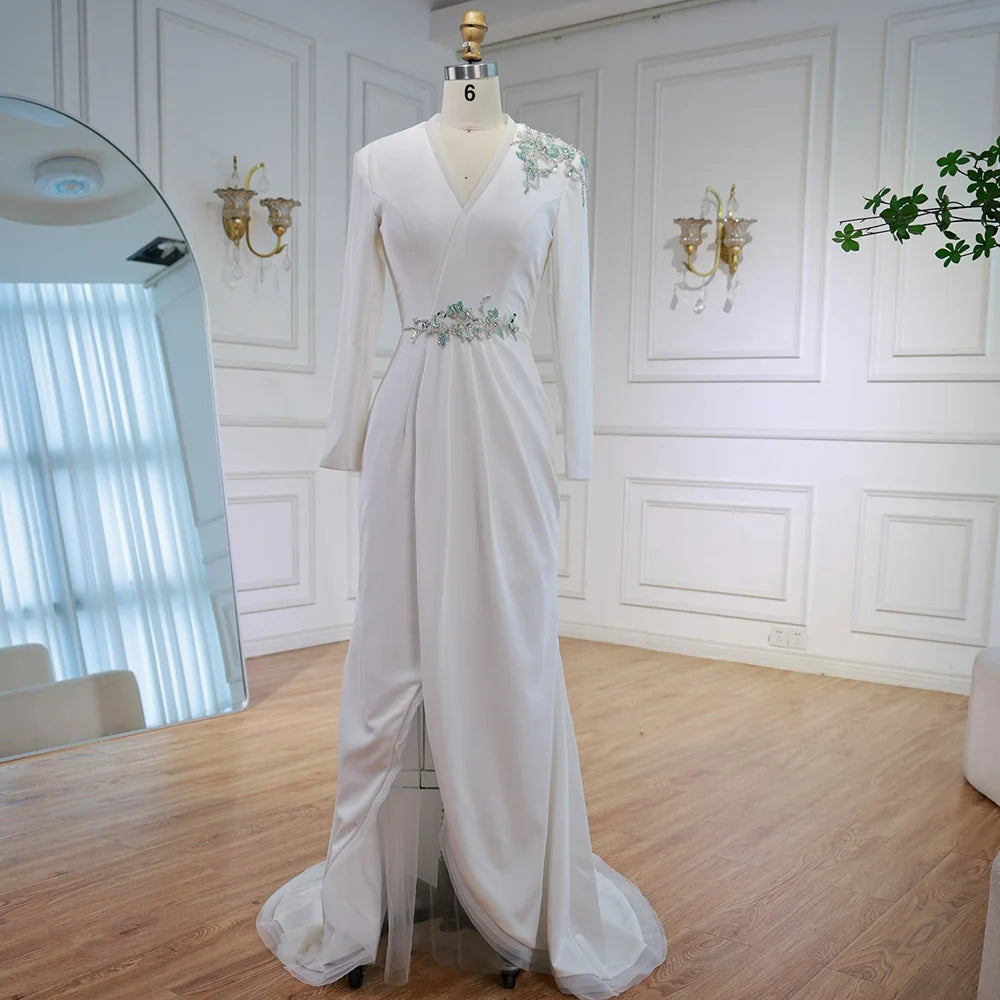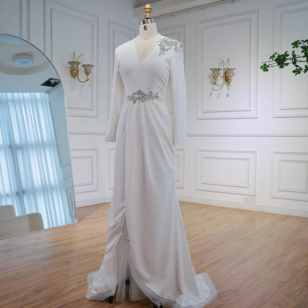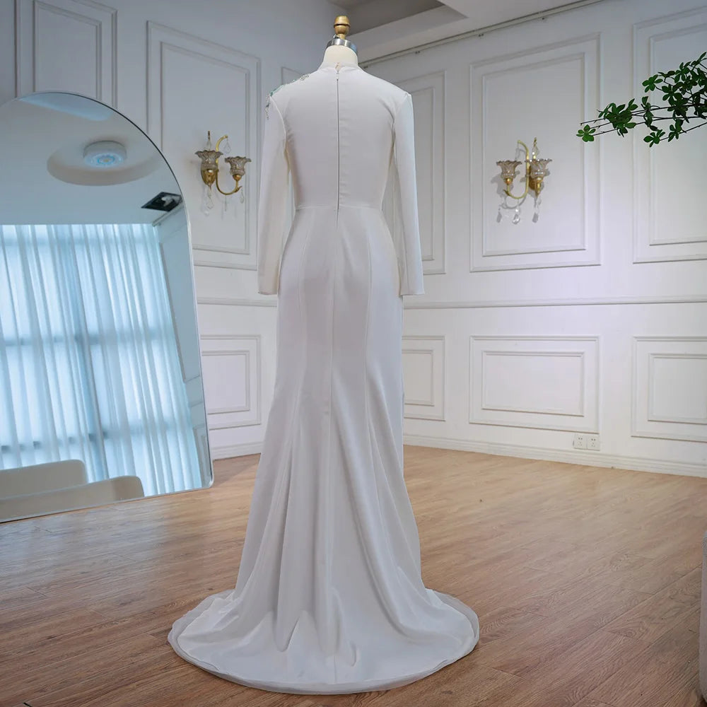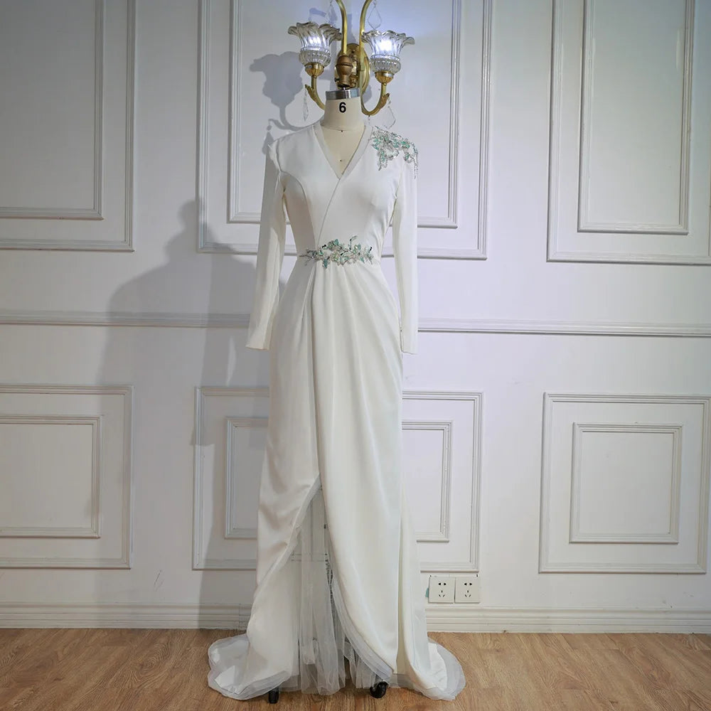 Elegant white evening dress featuring floral beaded appliqué and a stylish side slit. Perfect for formal events, weddings, or red carpet parties.