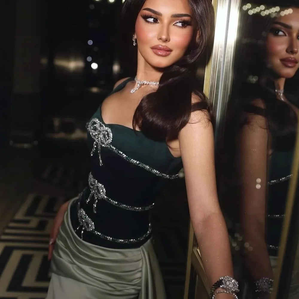 Elegant green satin mermaid evening dress with spaghetti straps and detachable overskirt. Features delicate beading, ideal for formal events and parties.