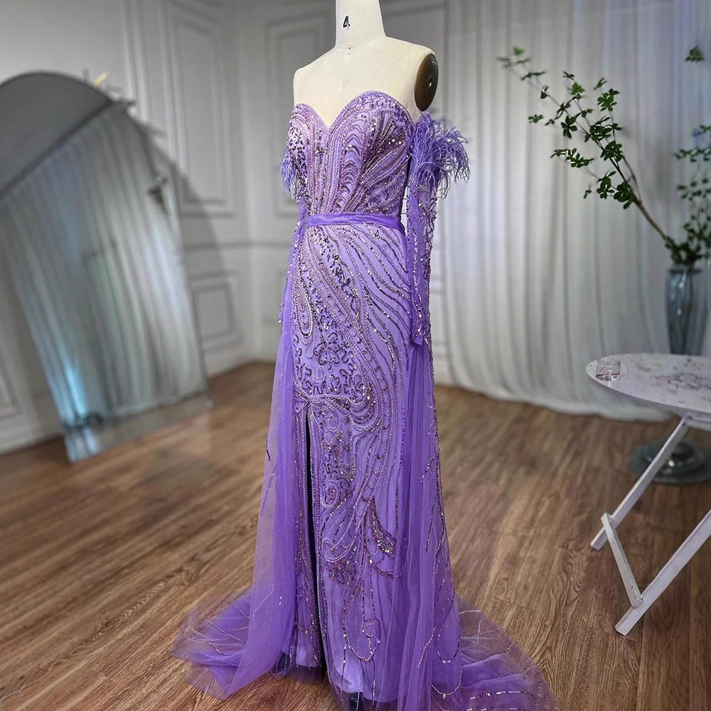 Luxury Arabic Nude Mermaid High Split Feather Beaded Evening Dress LA71910