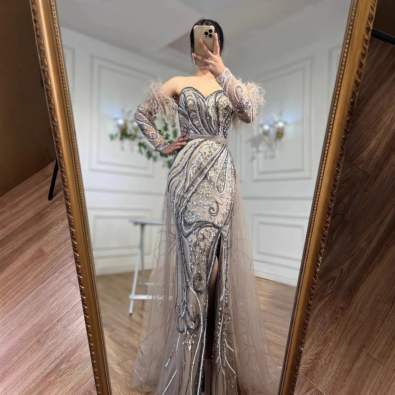 Elegant Arabic luxury nude mermaid evening dress with high split, feather details, and beads. Perfect choice for women at weddings, parties, and formal occasions.