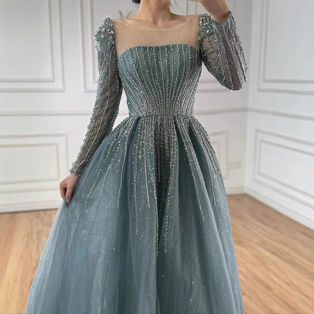 Luxury Arabic Turquoise A-Line Beaded Evening Dress LA72991A