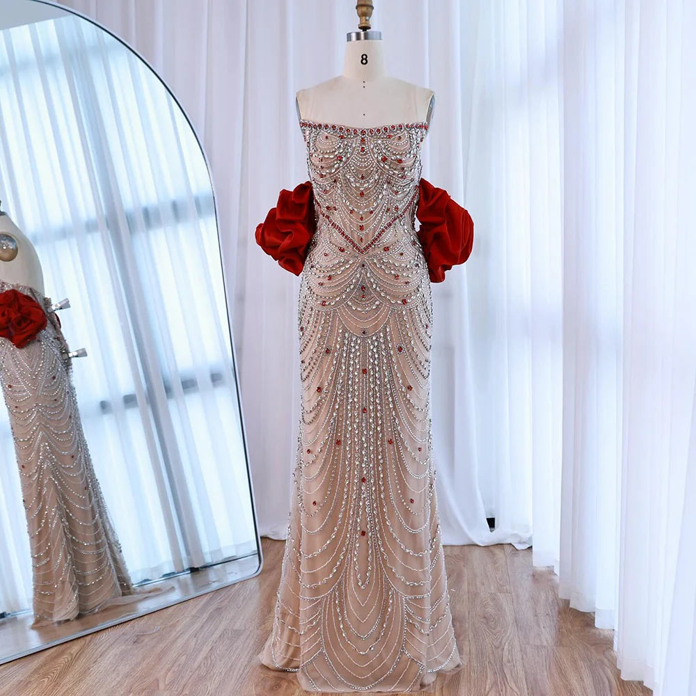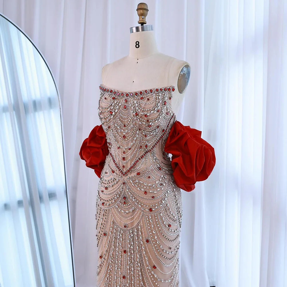 Luxury Beaded Evening Dress Puff Sleeves Pearl Adorned LA72903