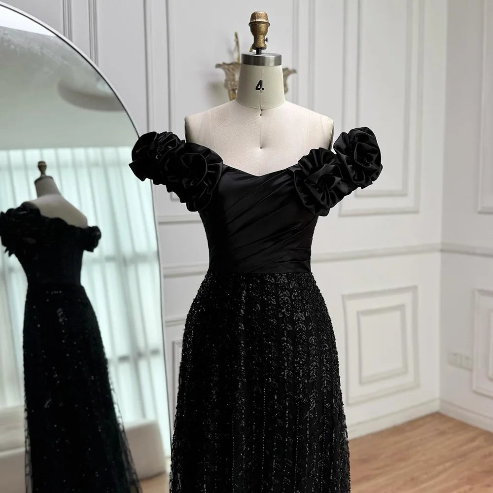 Luxury Black Off Shoulder Sequin Evening Dress with Floral Sleeves LA73096