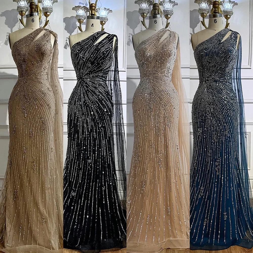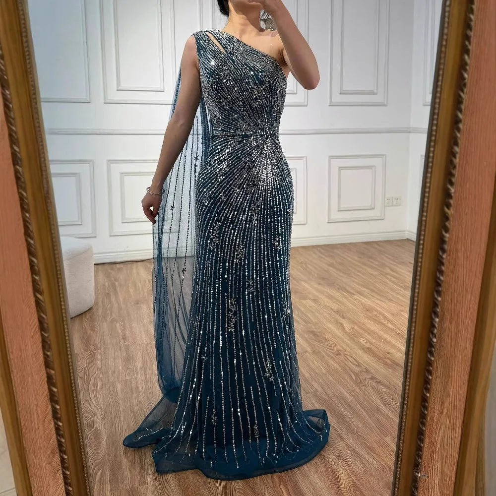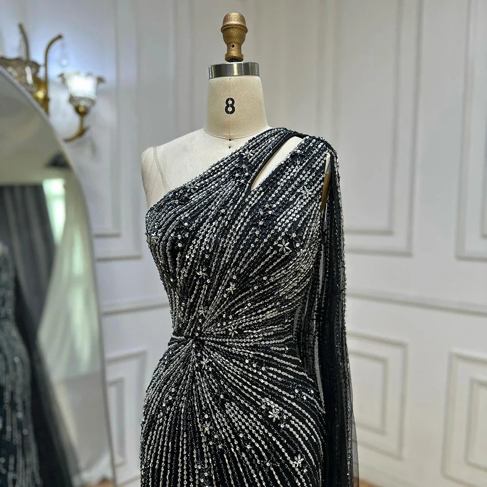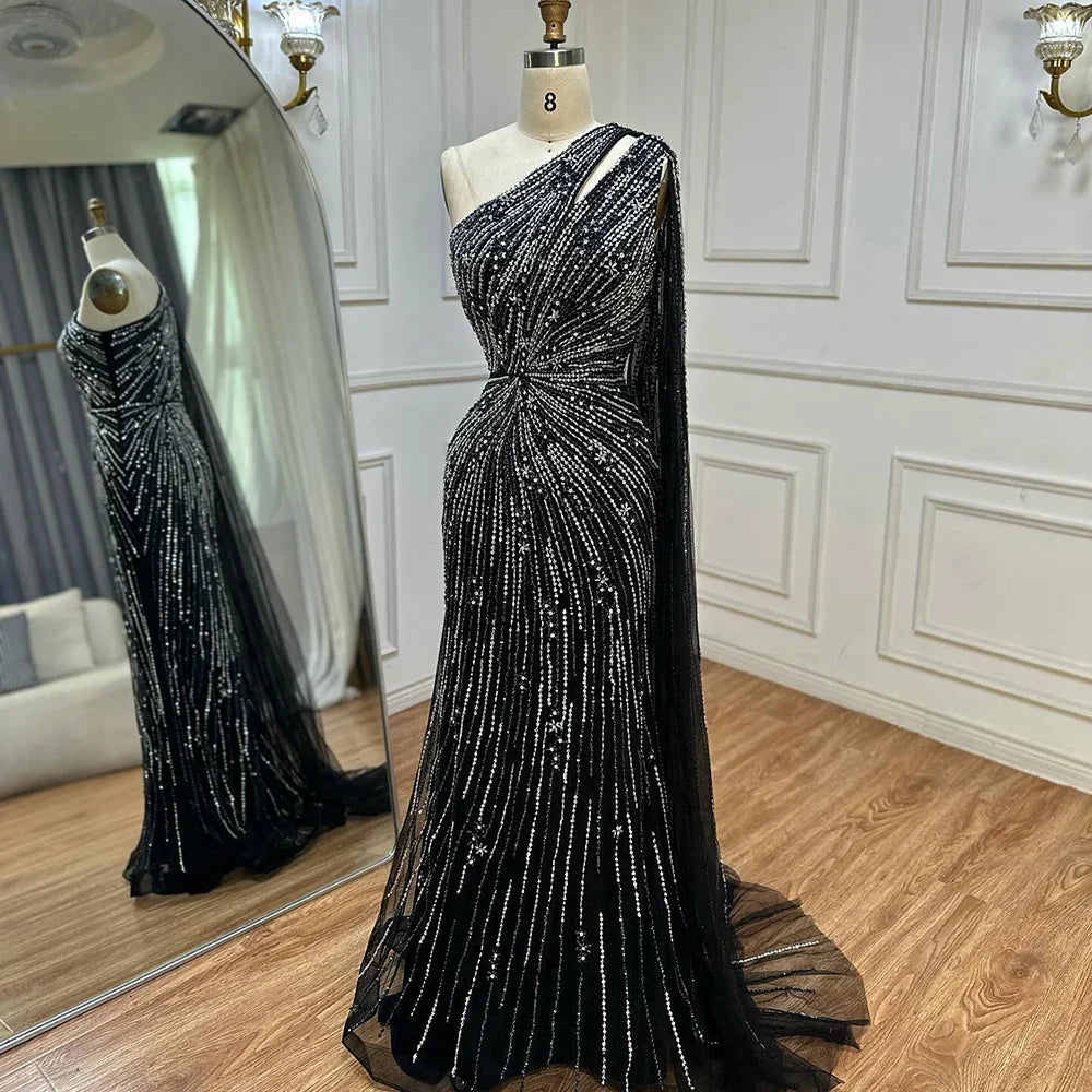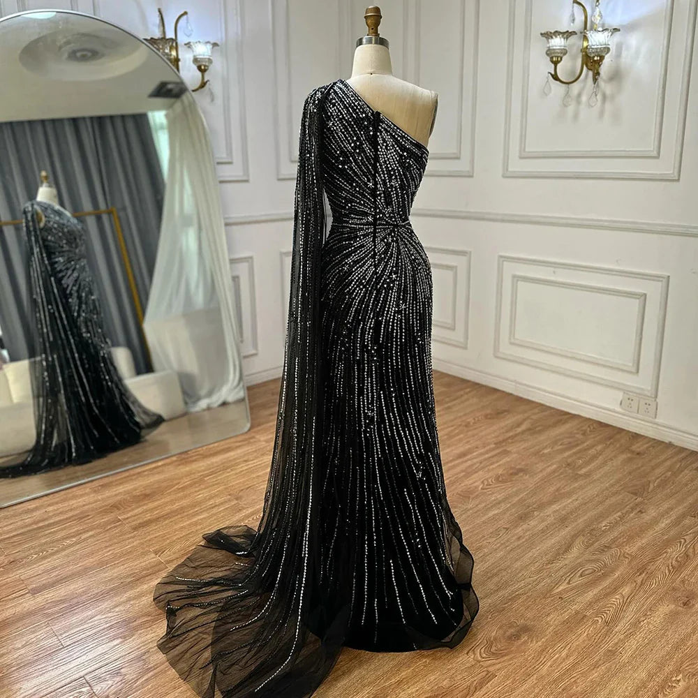 Luxury Black One Shoulder Mermaid Evening Dress with High Slit LA72829