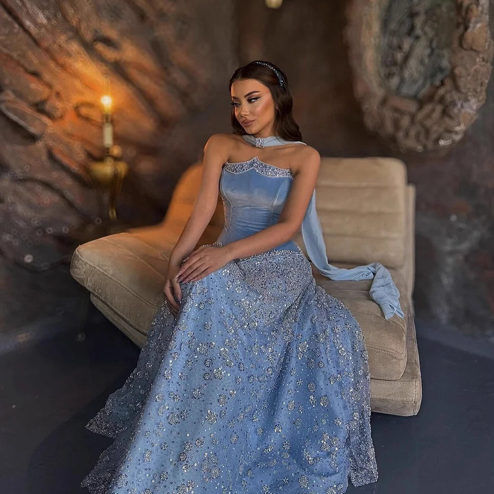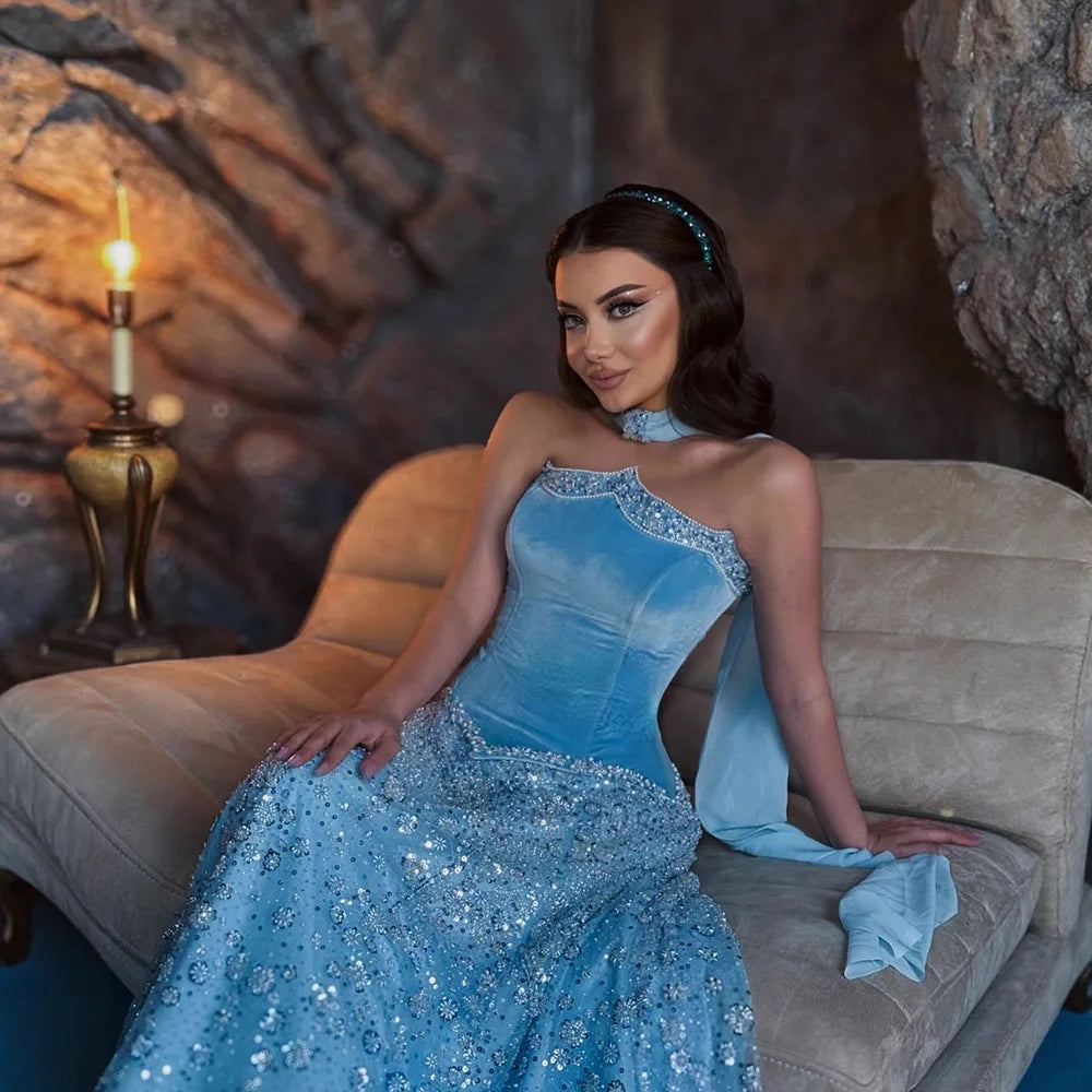 Elegant Arabic-style blue beaded A-line evening dress for women. Perfect for weddings, parties, and formal occasions.