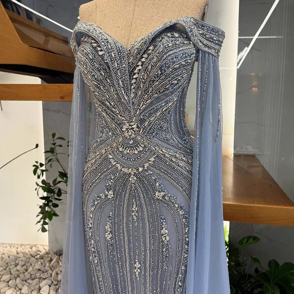 Luxury blue beaded cape sleeve Saudi Arabic evening dress LA73151, perfect for formal occasions, weddings, and elegant events.