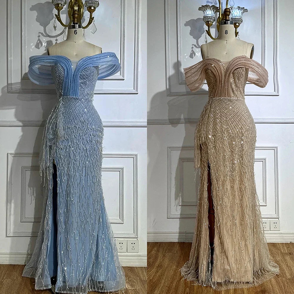 Elegant blue off-shoulder mermaid gown with sparkling beadwork and side split. Perfect for formal occasions, galas, and upscale evening parties.