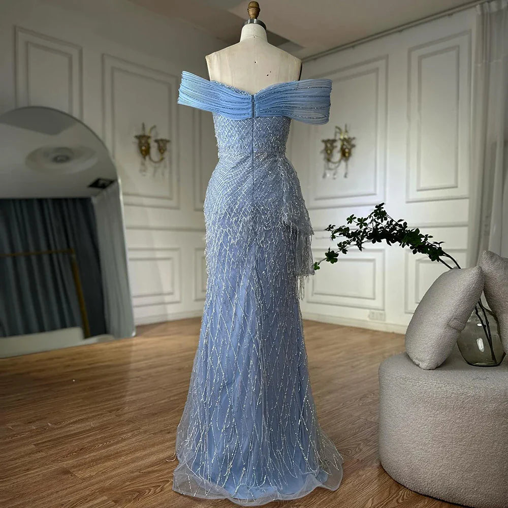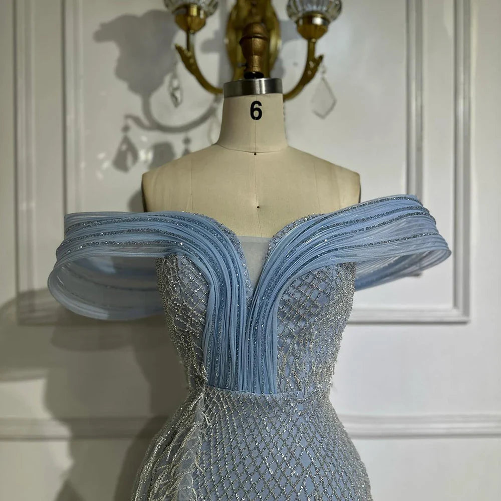 Luxury Blue Beaded Off-Shoulder Mermaid Evening Gown LA72867