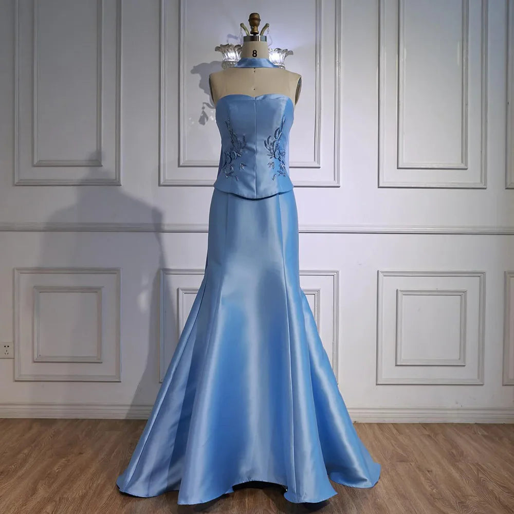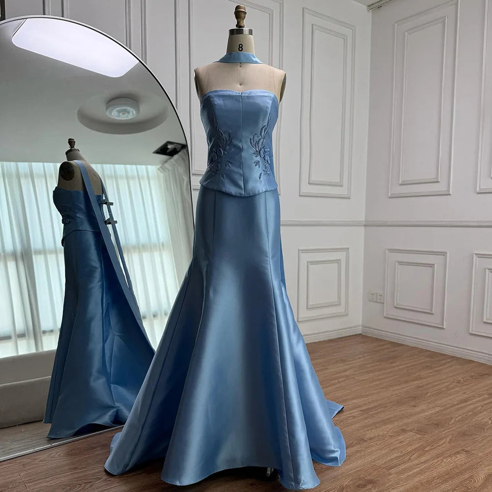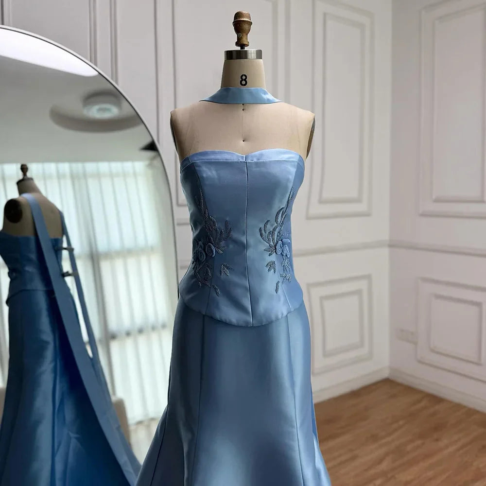 Elegant blue satin mermaid evening gown featuring a dramatic long scarf detail. Perfect for Saudi and Dubai style formal occasions and red-carpet events.