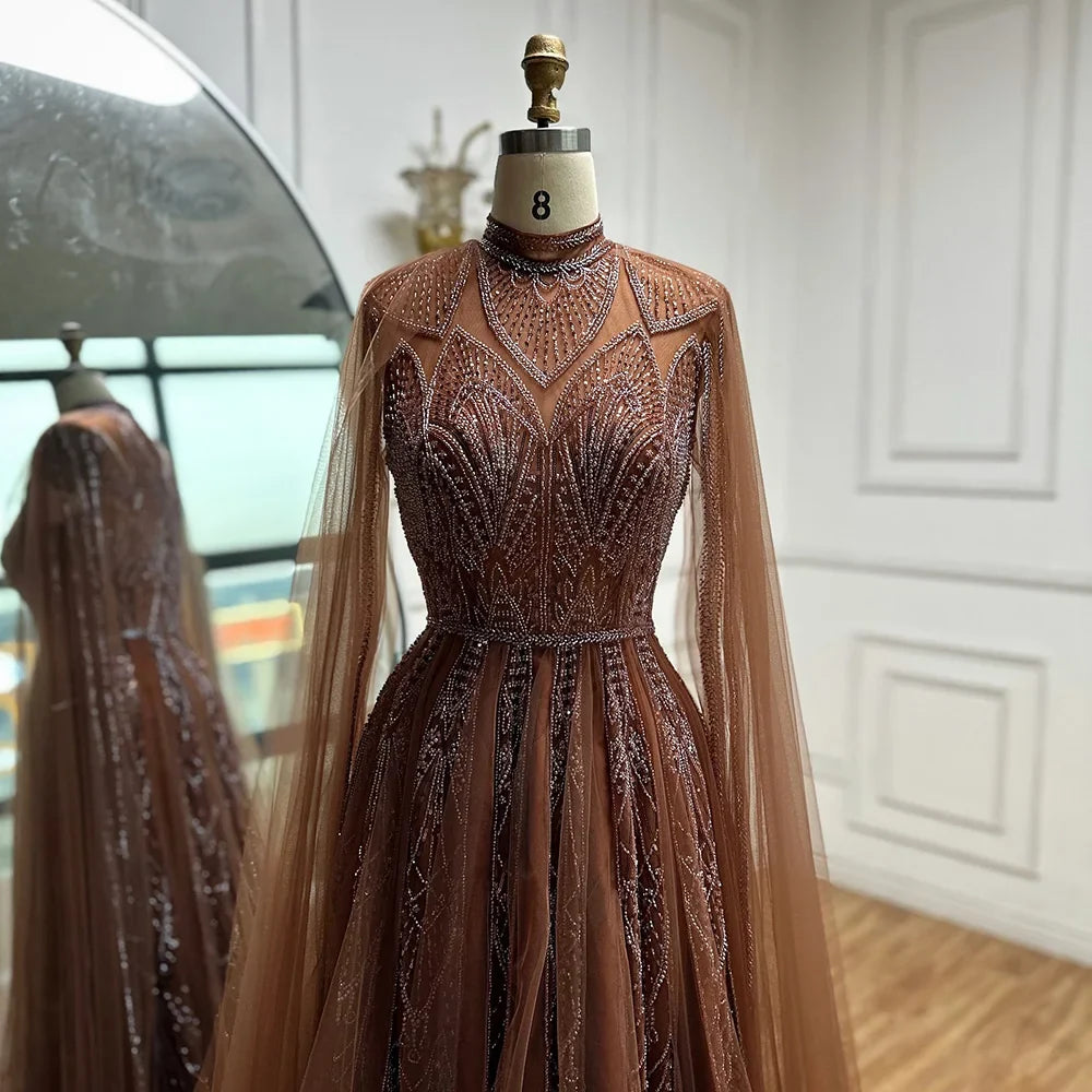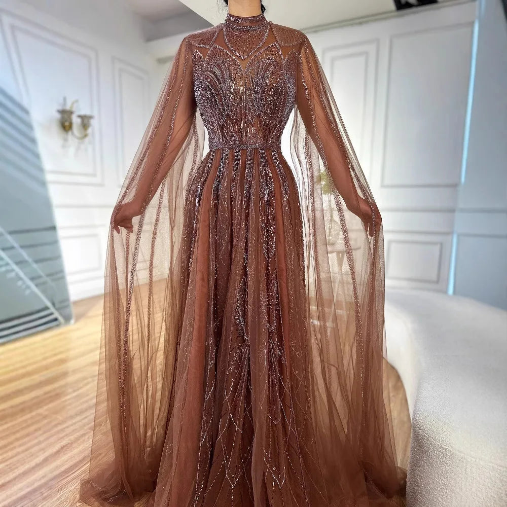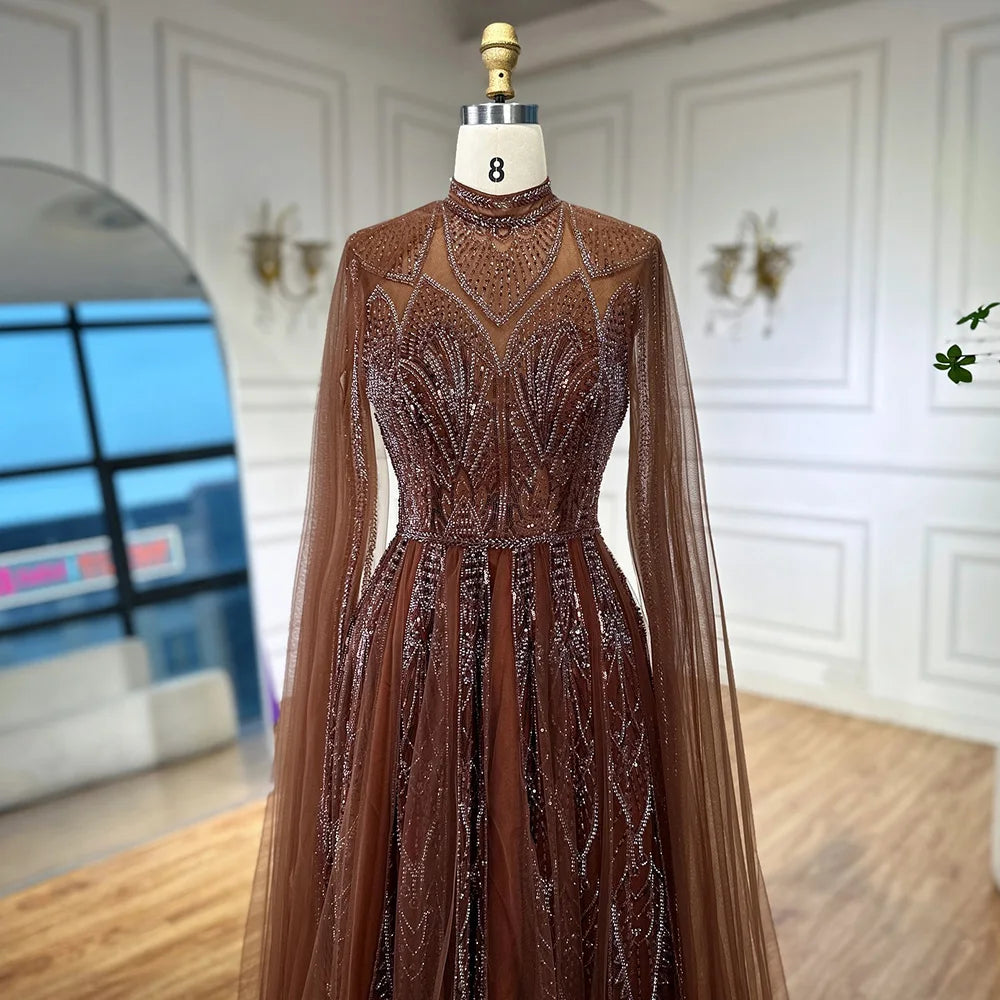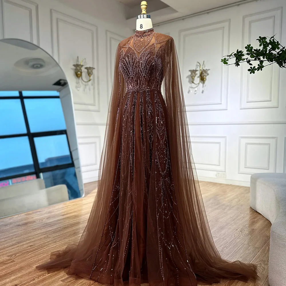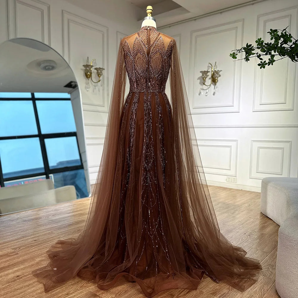 Luxury Brown Beaded Evening Gown with Cape Arabic Style LA72951