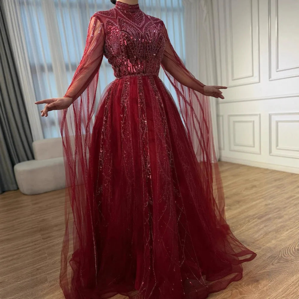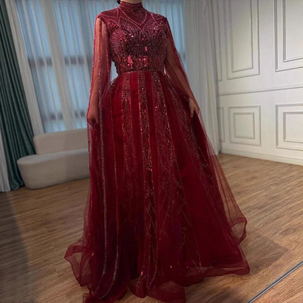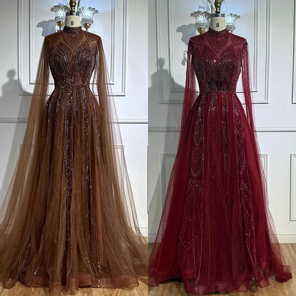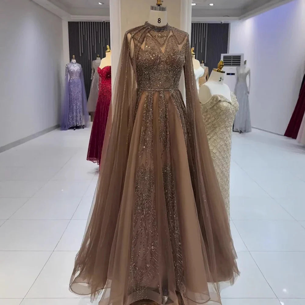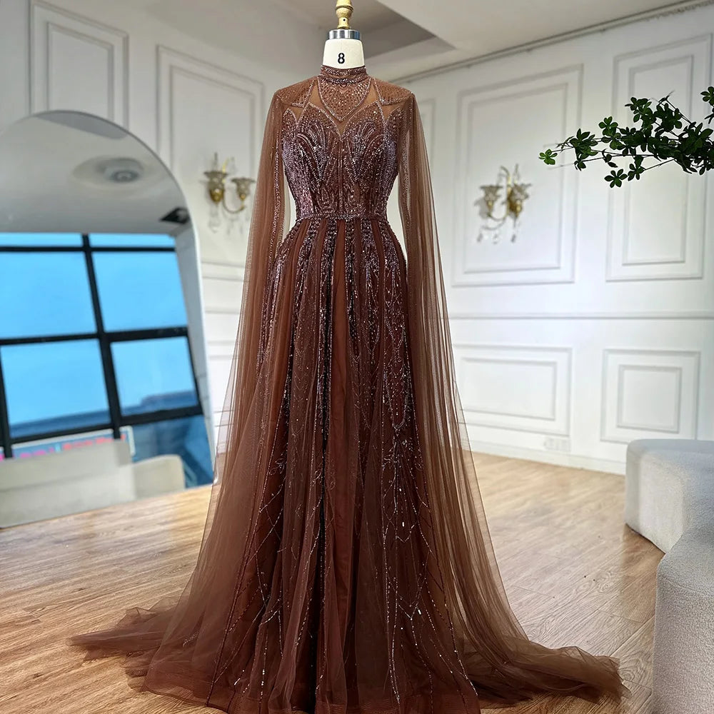Luxury Brown Beaded Evening Gown with Cape Arabic Style LA72951
