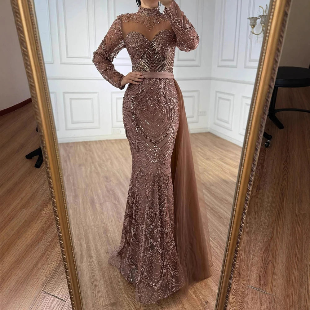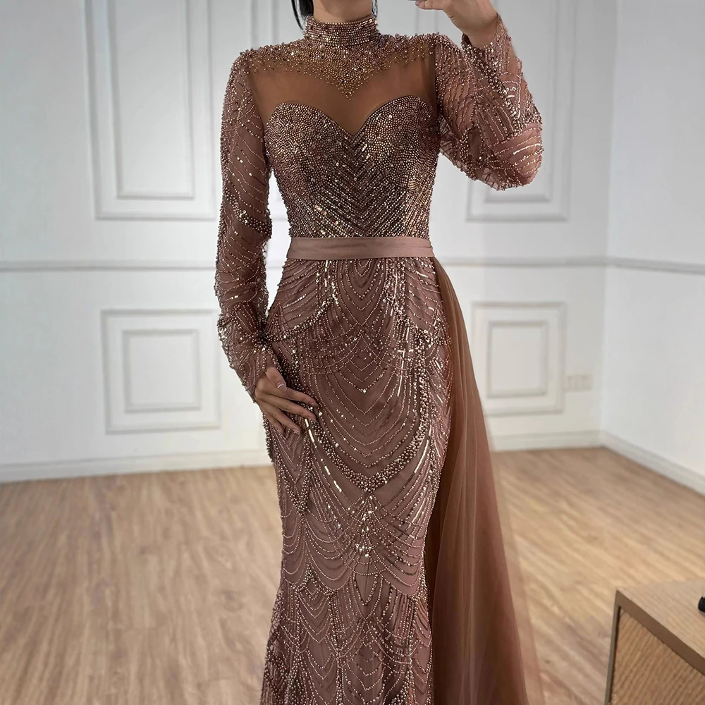 Luxury Brown Beaded Mermaid Evening Dress with Side Overskirt LA71913A