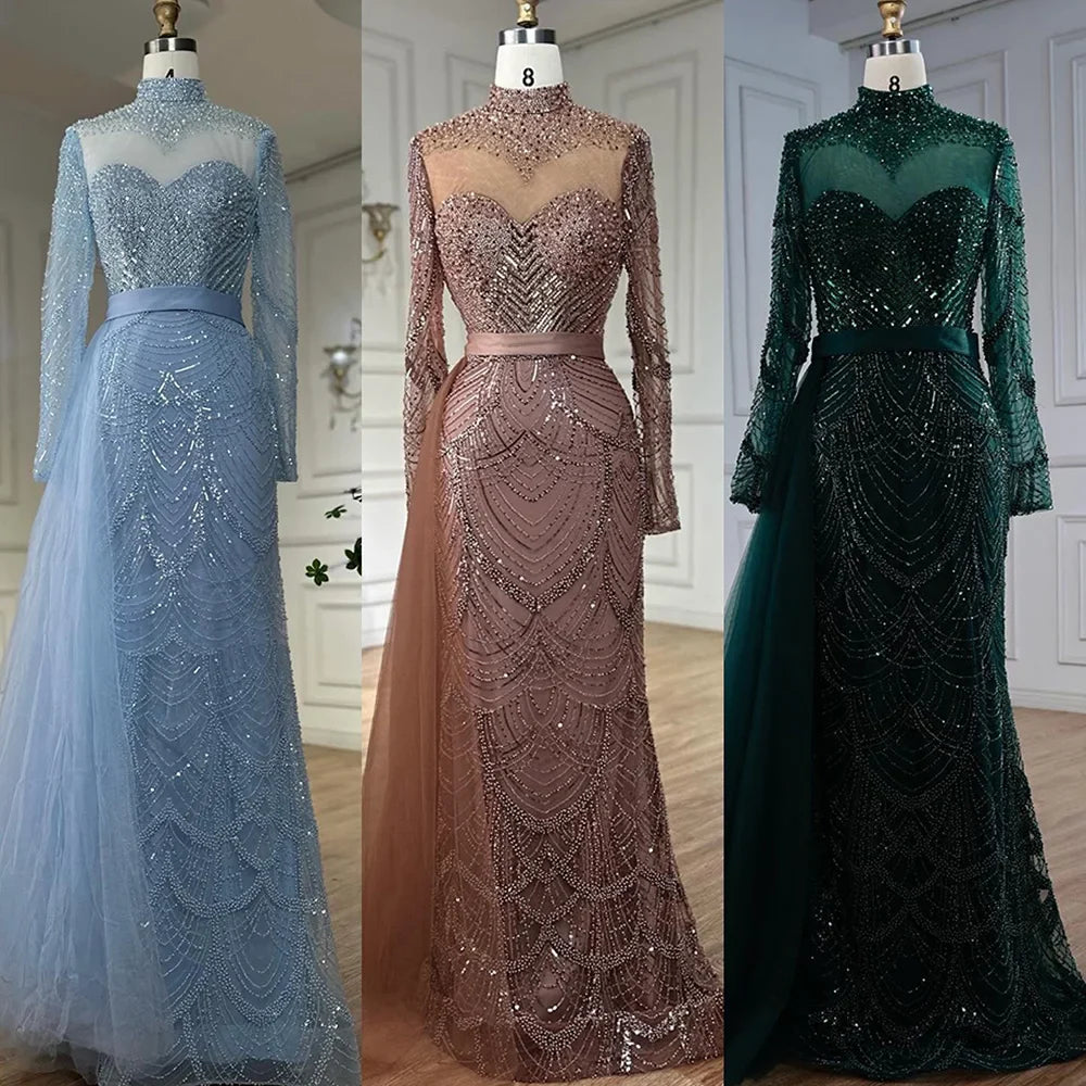Luxury Dubai-style brown mermaid evening dress with intricate beadwork and dramatic side overskirt. Perfect for Arabic formal occasions.
